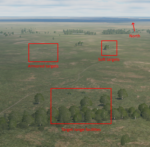 A2G Range - Has bombing and strafing pits, as well as a mixture of soft and hard armoured targets. Marked with a large smoke column