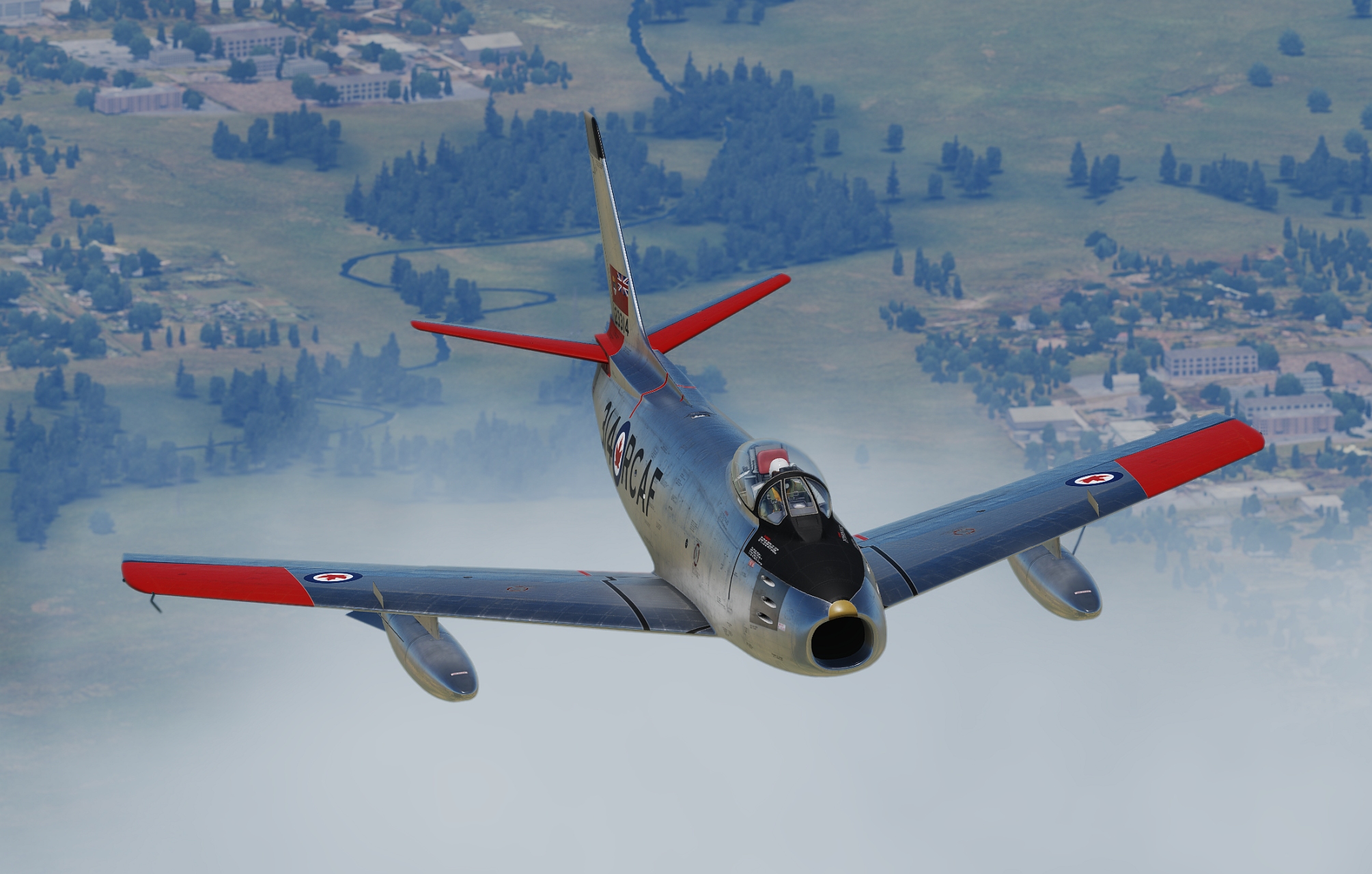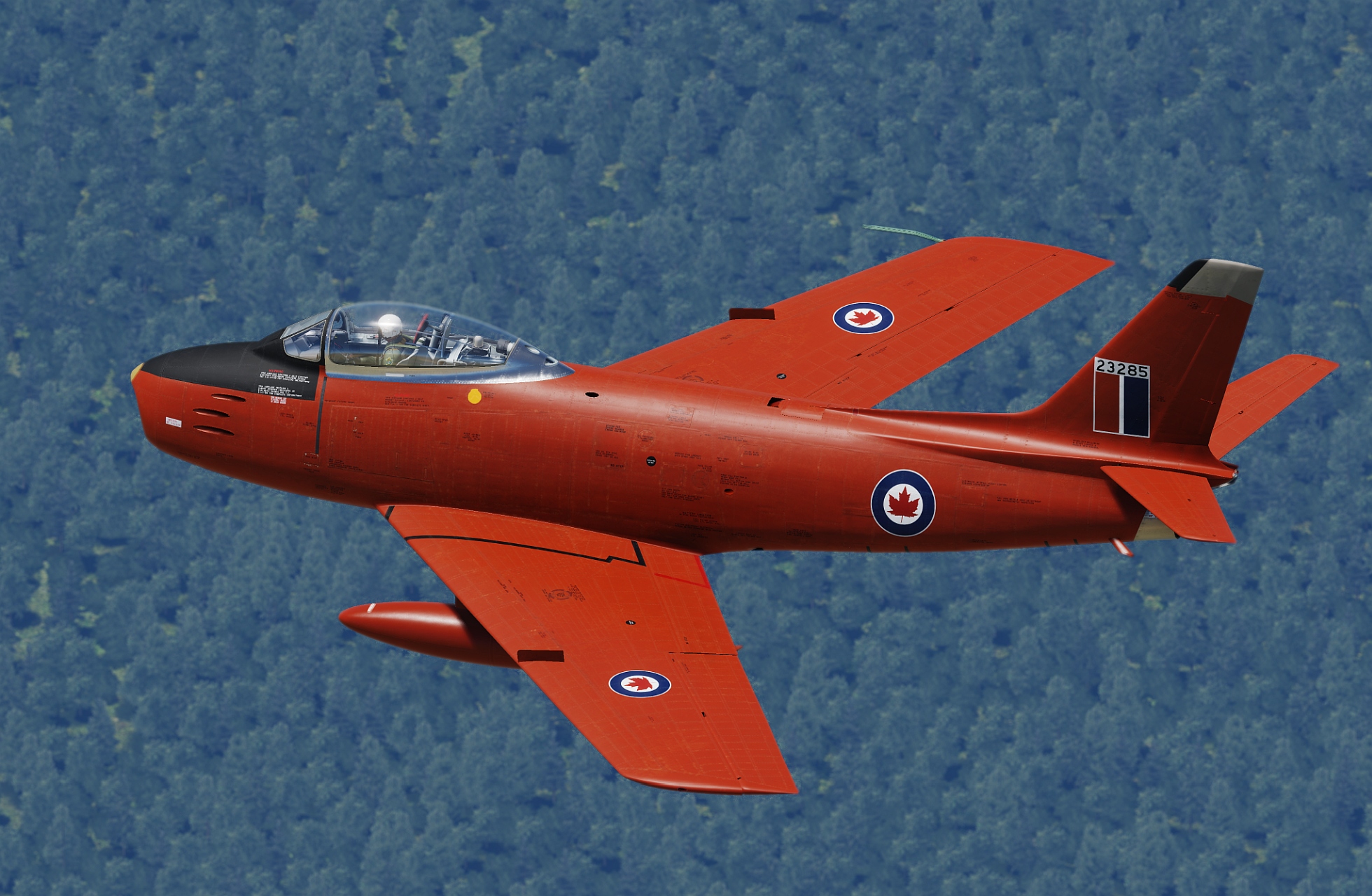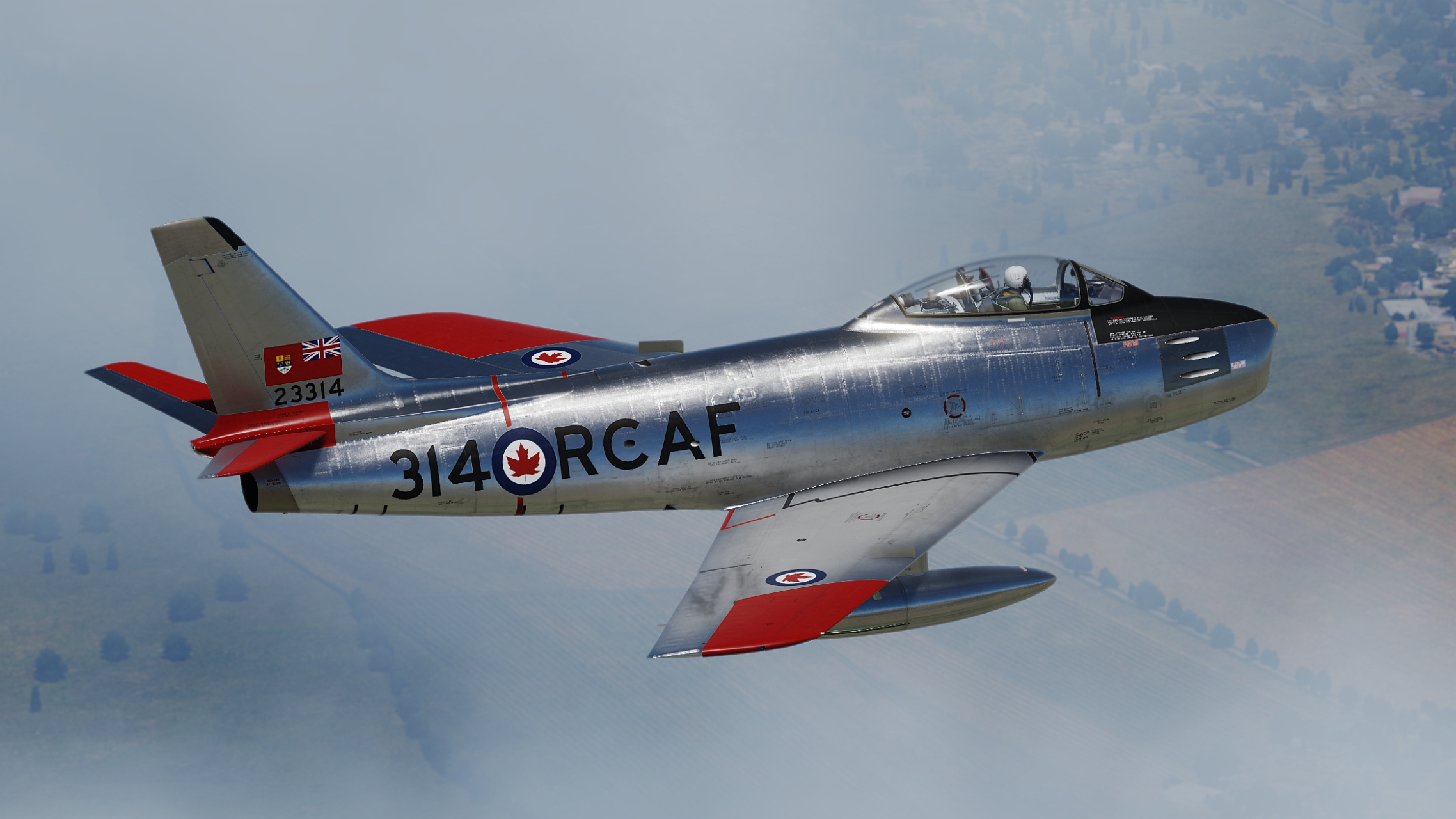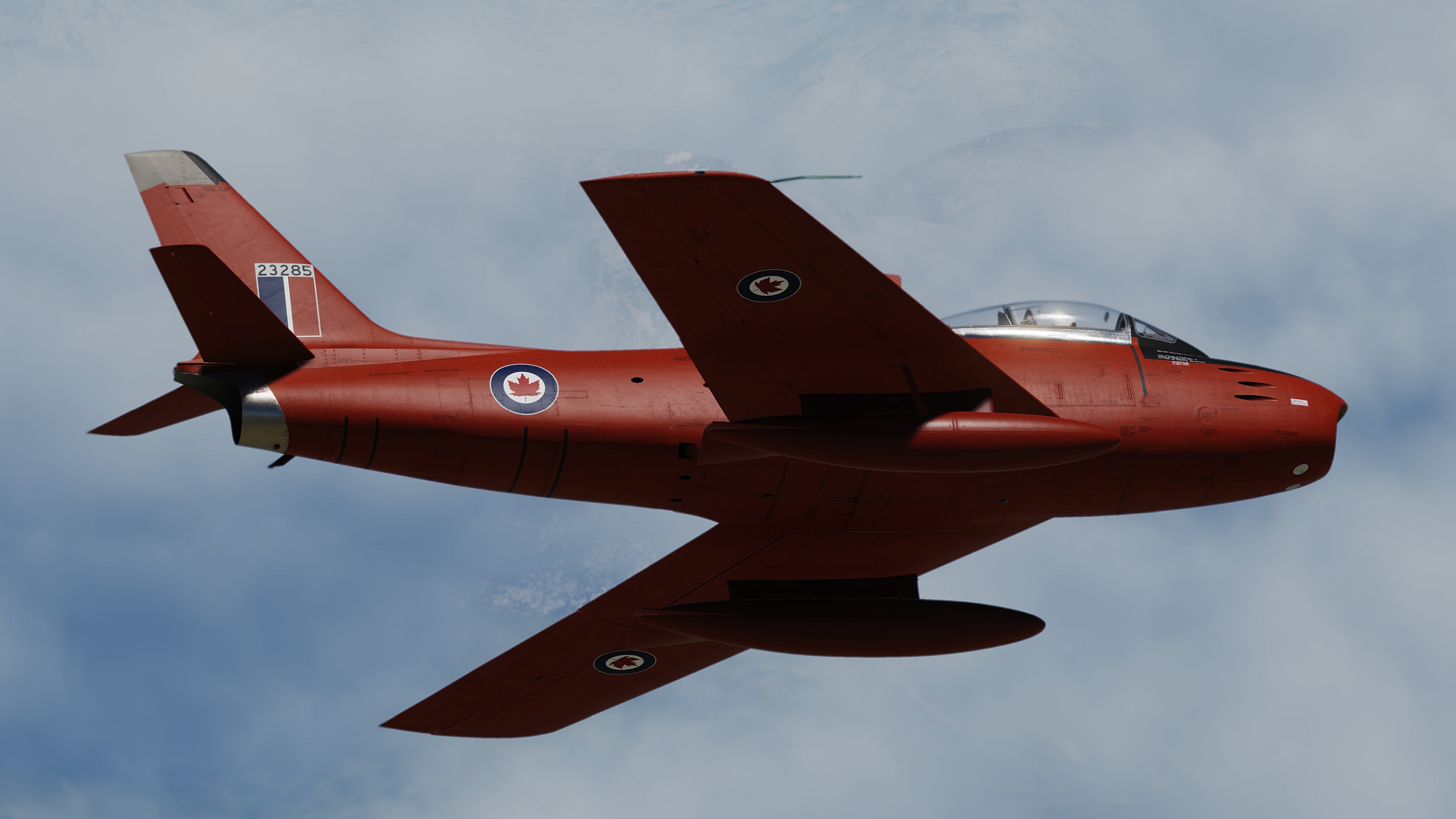 Sabre Mk. 5 23314, originally taken on charge in 1954. Would eventually see service with 441 Squadron and RCAF Chatham STU Pilot training school. It was sold to the civilian market in 1973. It was involved in an incident in 1976 and necessitated repairs, one of which was the fitting of a slatted F-40 wing with wing tip extensions, effectively making it a Mk. 6. It flew the US air show circuit as "The Huff" for years afterwards and in 2007 it was acquired by Vintage Wings of Canada and repainted as Hawk One for the 2009 Centennial celebrations.