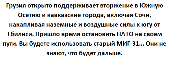Georgia esta dando apoyo abiertamente a una invasion a Osetia del Sur y las ciudades del caucaso ilcluida Sochi, acumulando fuerzas terrestres y aereas al sur de la ciudad de Tifilis.  Es hora de parar los pies en seco a la OTAN. Usaras un viejo MIG31...No saben la que se les avecina.