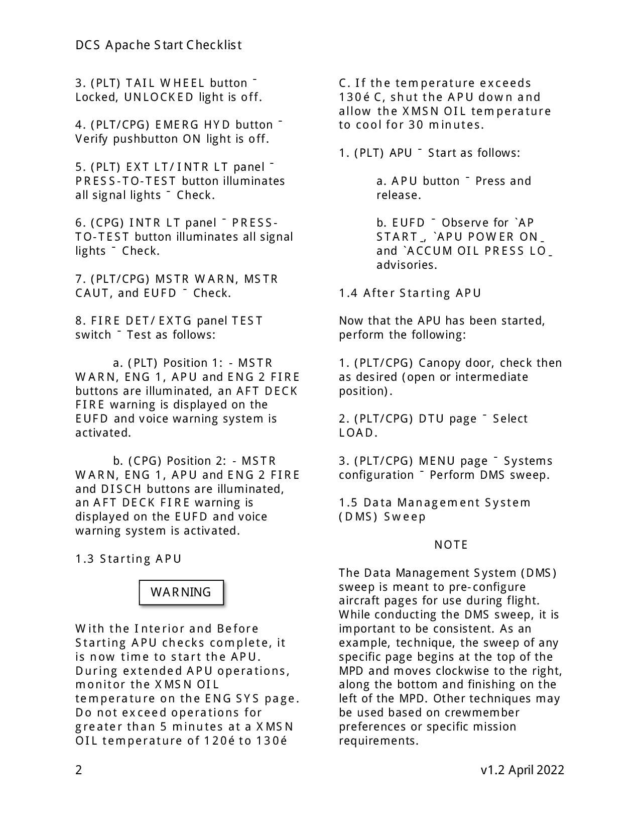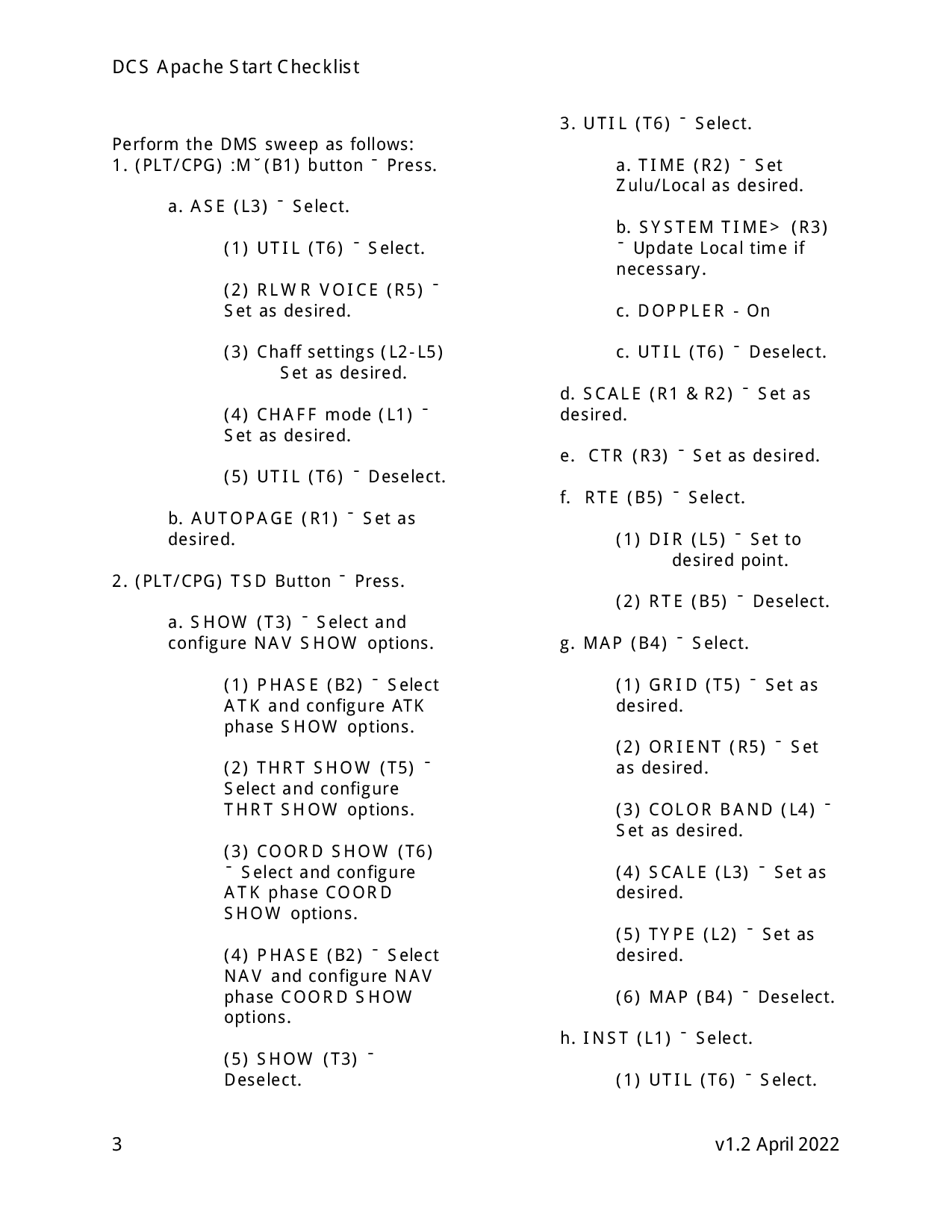 PDF Start-up checklists (long and quick start versions) with abbreviated location information for each step. Great for beginners and people who like to fly multiple airframes and need a quick reference. Sequence based primarily on Chuck's Guides. Look for other module checklists (F-16, F/A-18, P-51D and more being added)