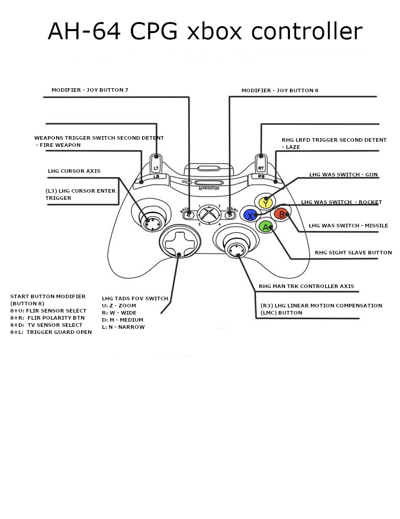 Controls for the AH-64 CPG using the NXT Gladiator stick, TWCS throttle, and XBOX controller.