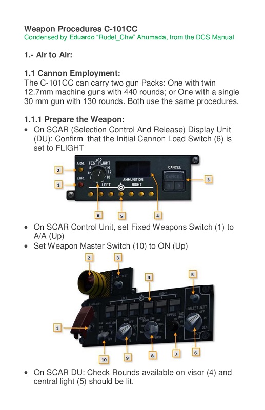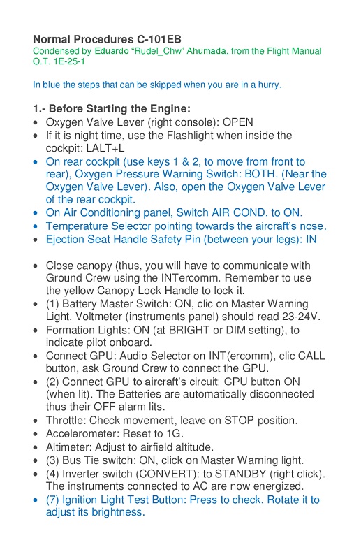 I've written a Kneeboard-size version of the C-101 Procedures, summarized from several sources: The Flight Manual of the real C-101EB, the DCS Manual of the C-101 and Information from ED's Forum. It's divided on three Parts: