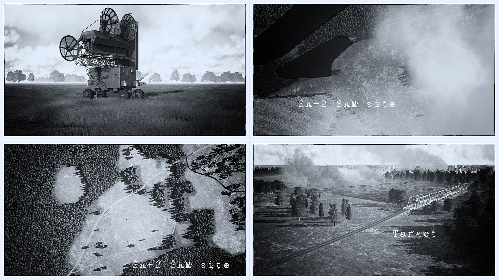 A strike package of two VMA-311 A-4E Skyhawks ("CAT flight") is tasked to bomb a bridge in the north to cut the vital supply routes of the Ho Chi Gurk trail. An RF-8 recce Crusader shot photos of two Gurkcong SA-2 Guideline SAM units in the area. Your mission is to fly ahead of the strikers and silence the SA-2s.