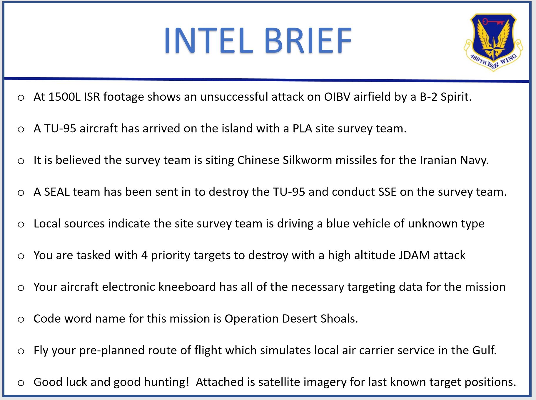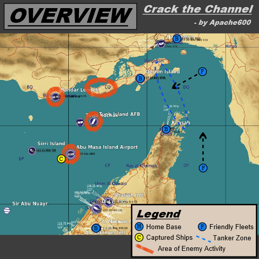 This mission takes place in the Persian Gulf. Terrorists have launched an offensive from their stronghold in Iran and are in the process of taking over various islands in the straight. Listen to mission tasking for prioritization of targets.