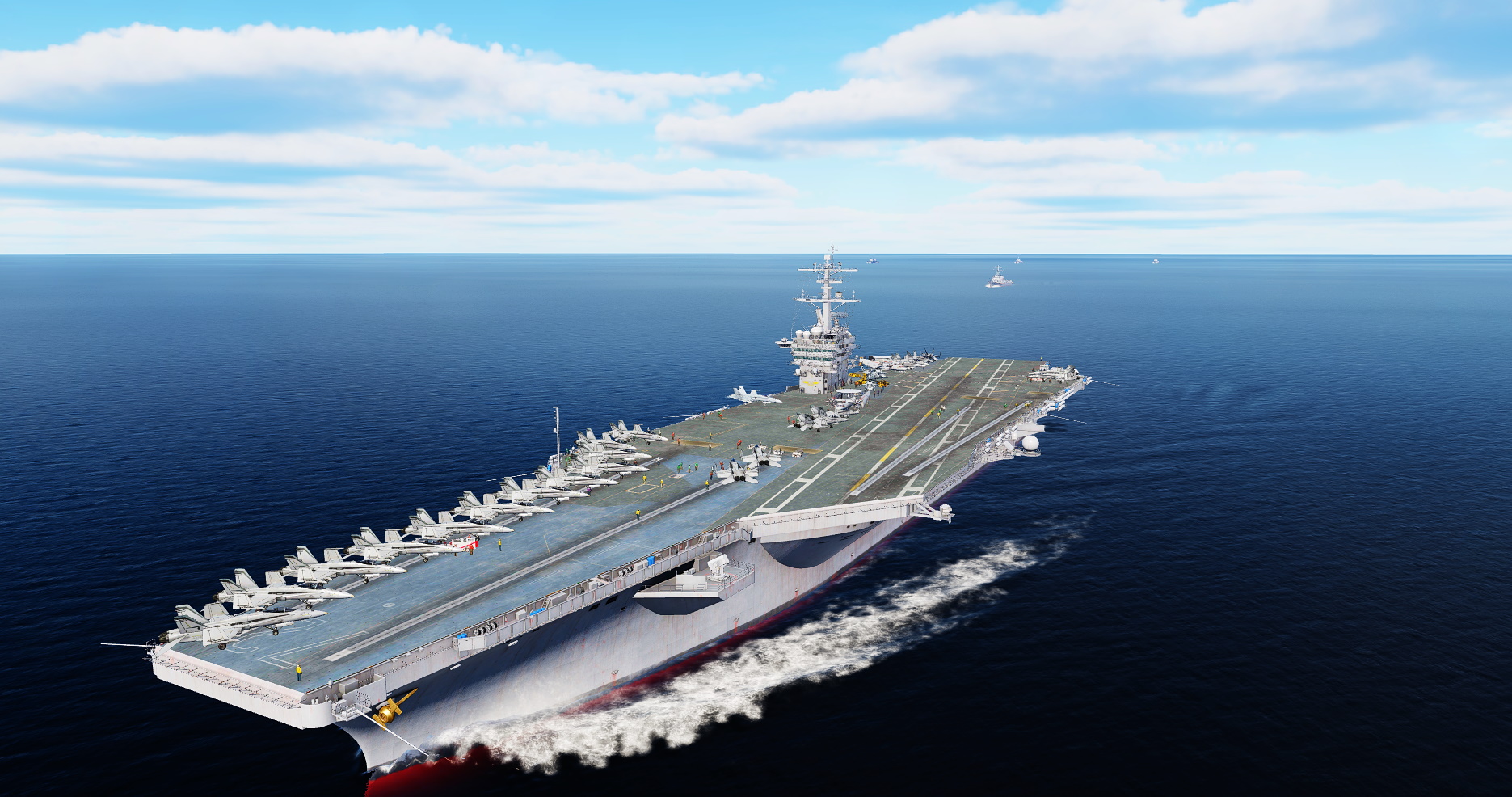 A large carrier battlegroup with busy (but still functional) Carrier decks, including the Supercarrier GW, HMS Invincible and Tarawa.