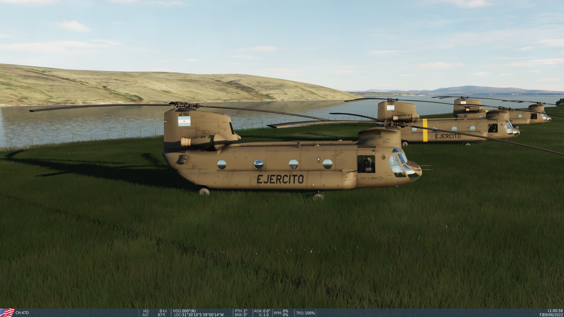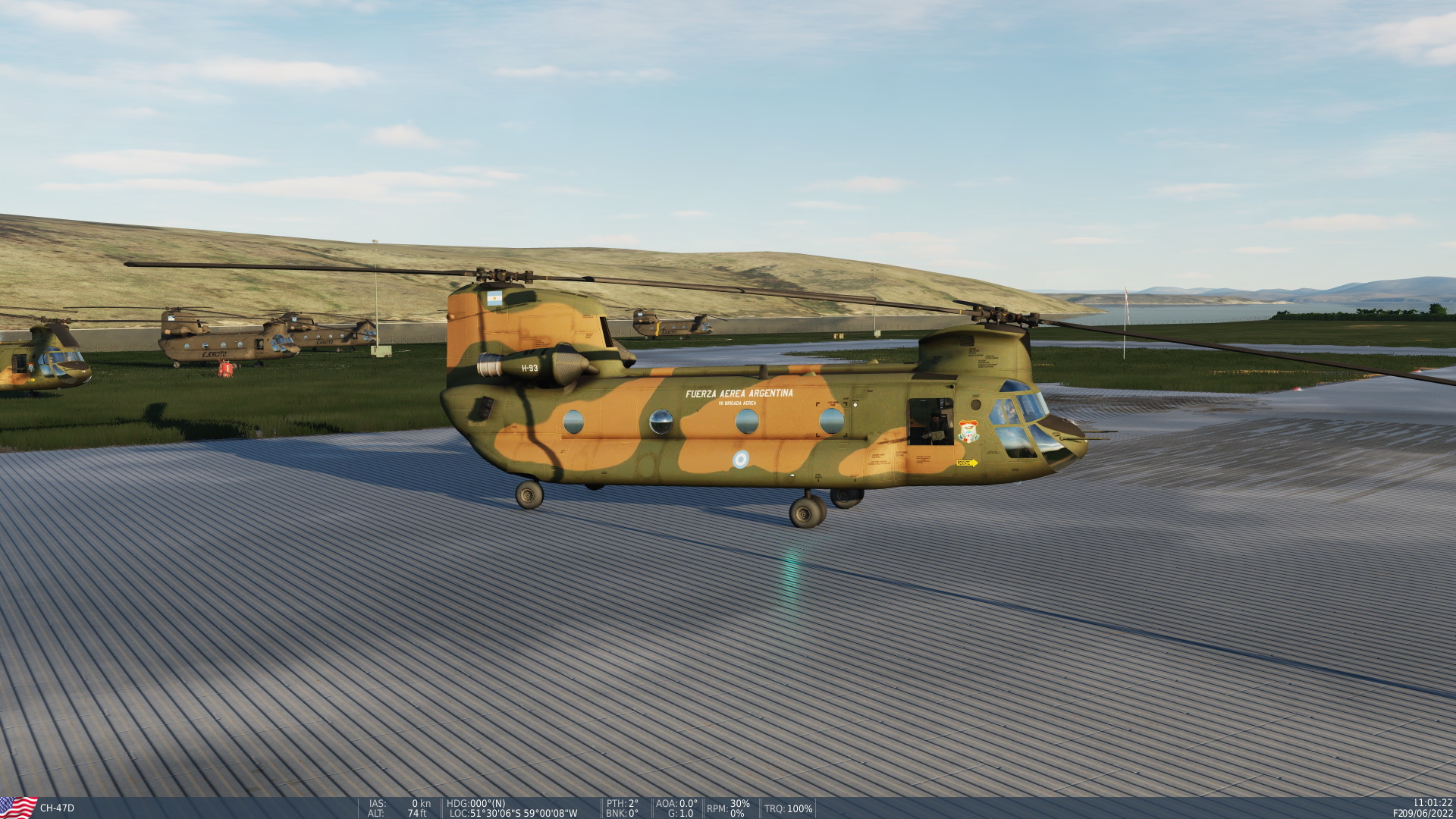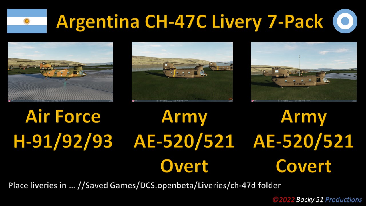 Three livery schemes of the Argentina Army and Air Force CH-47C Chinook helicopter suitable for use in the South Atlantic Map circa 1982.