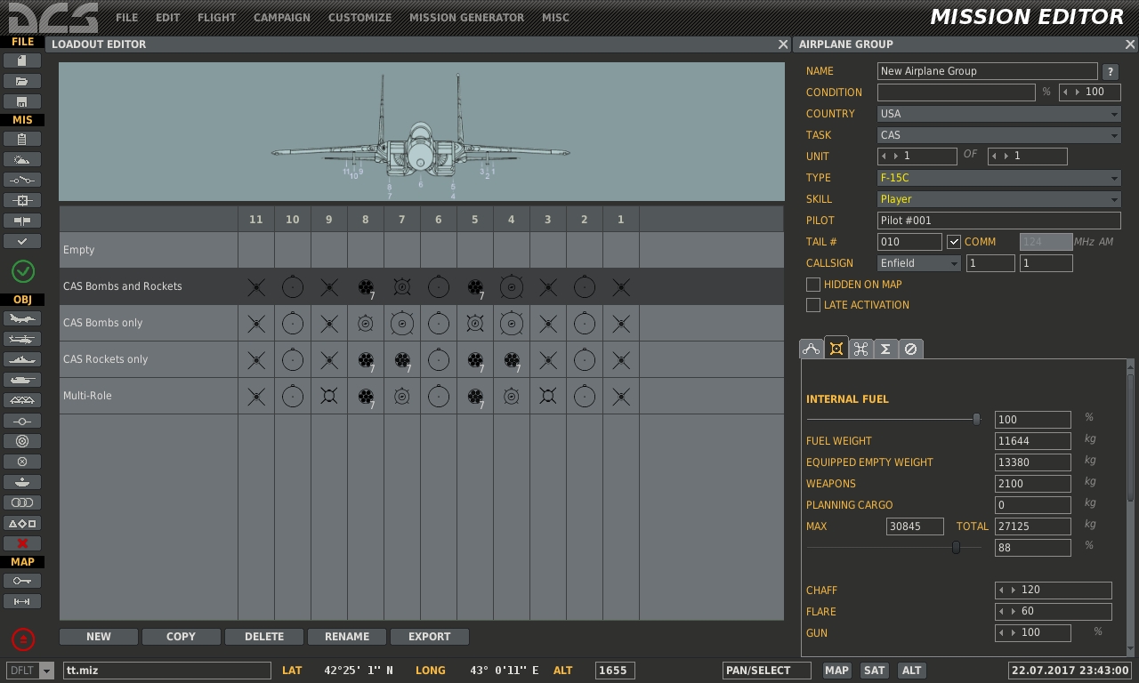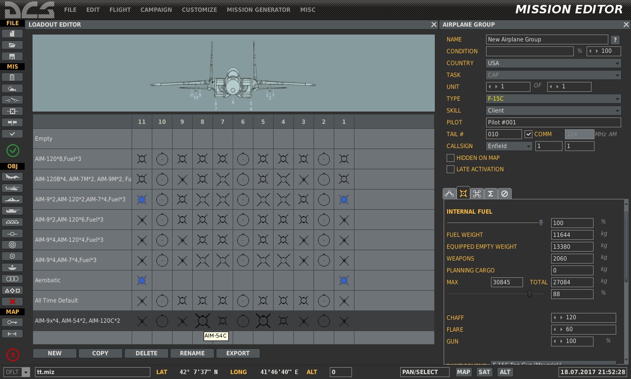 Aim-9x, Aim-54 Phoenix, R-33, R-37, Aim-120B, Aim-120C, Matra Magic II missiles with an active A-G mode for the F-15C, including un-guided rockets and bombs.