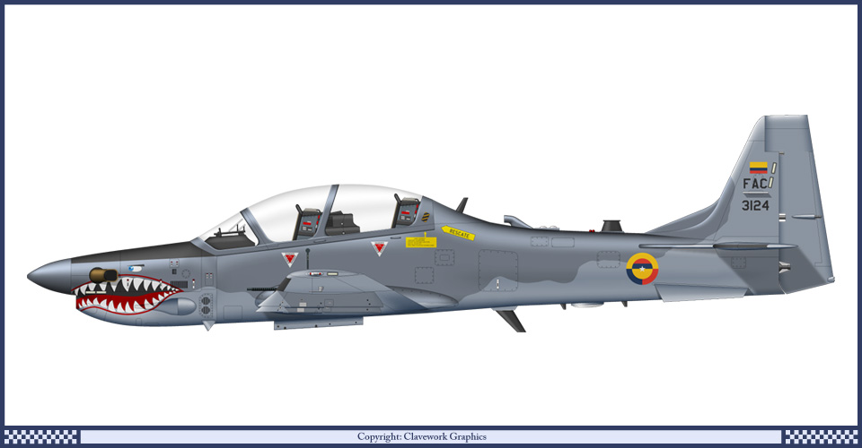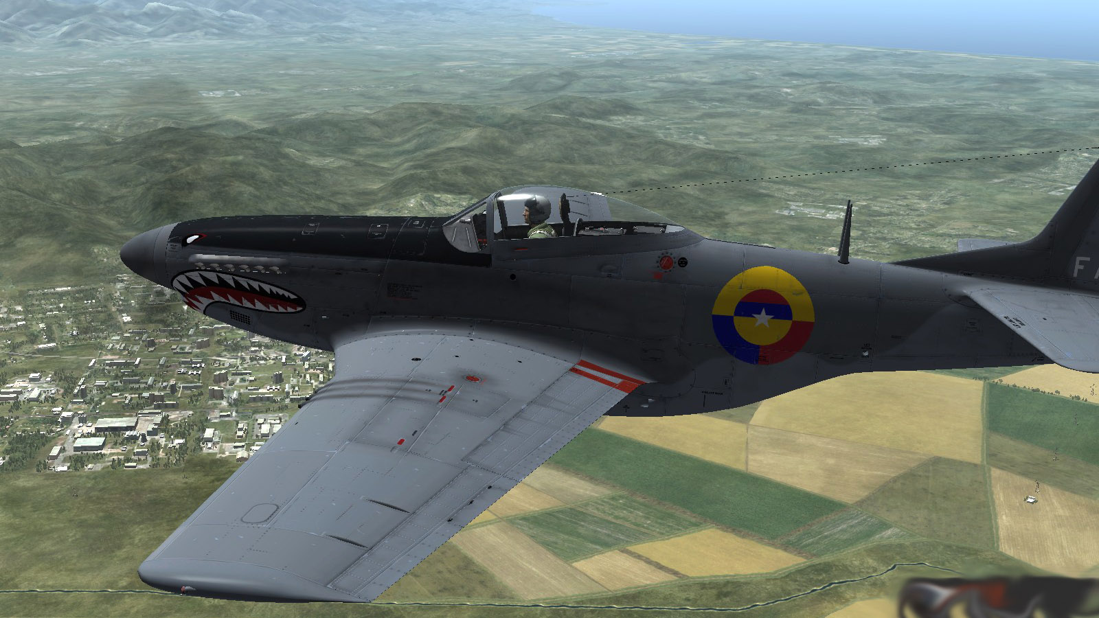 This is a package of two P-51D skins using the current Fuerza Aérea Colombiana grey paint scheme used for the Super Tucano.  One version of the skin has a "shark mouth" on the nose.  Nationalities are USA and Spain.