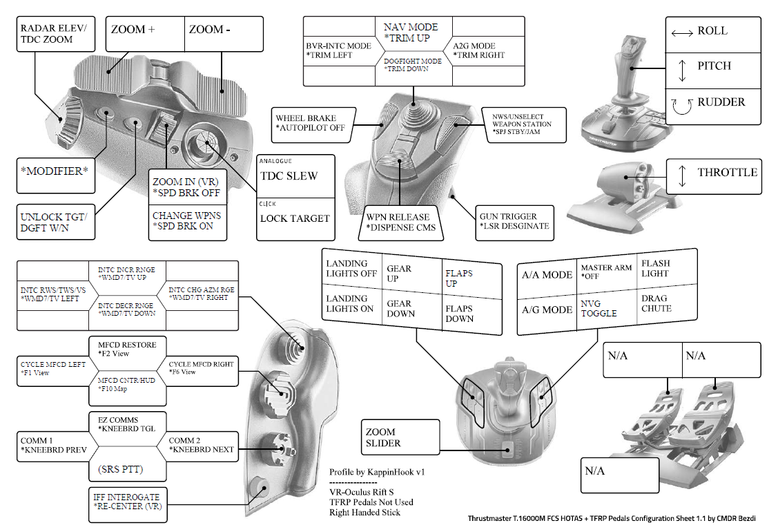 This profile was designed in a way that keeps your hands off the keyboard and on the HOTAS in a well thought out manner. The profile has went through many testing cycles and this is the final version. I can assure you can take off, conduct a sortie and land without resorting to your keyboard. Please have a look at the attached configuration sheet.