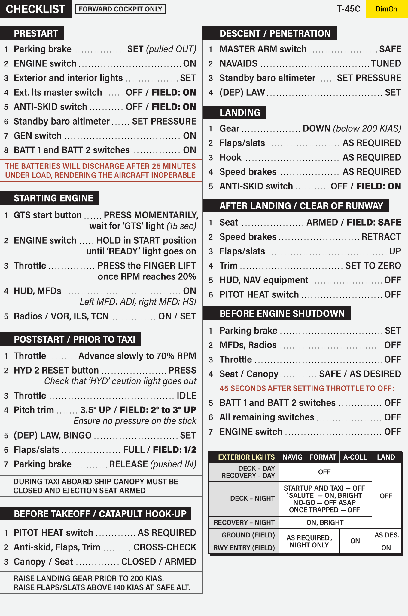 Checklists, RWR threats, ordnance list, landing patterns, quickstart, and 31 emergency procedure to spice it all up.