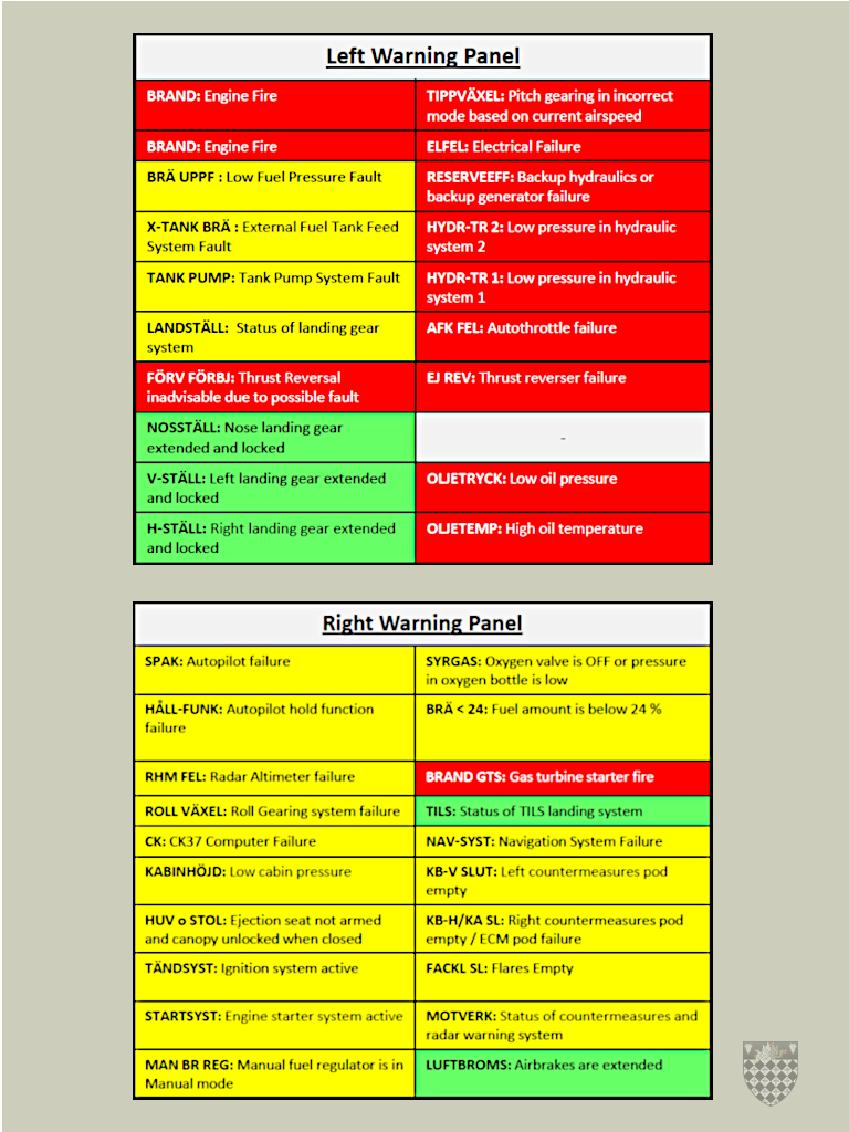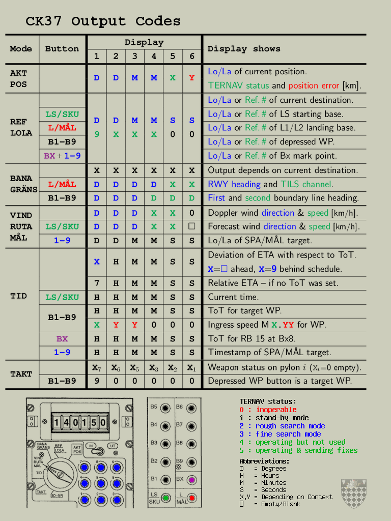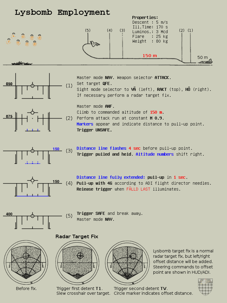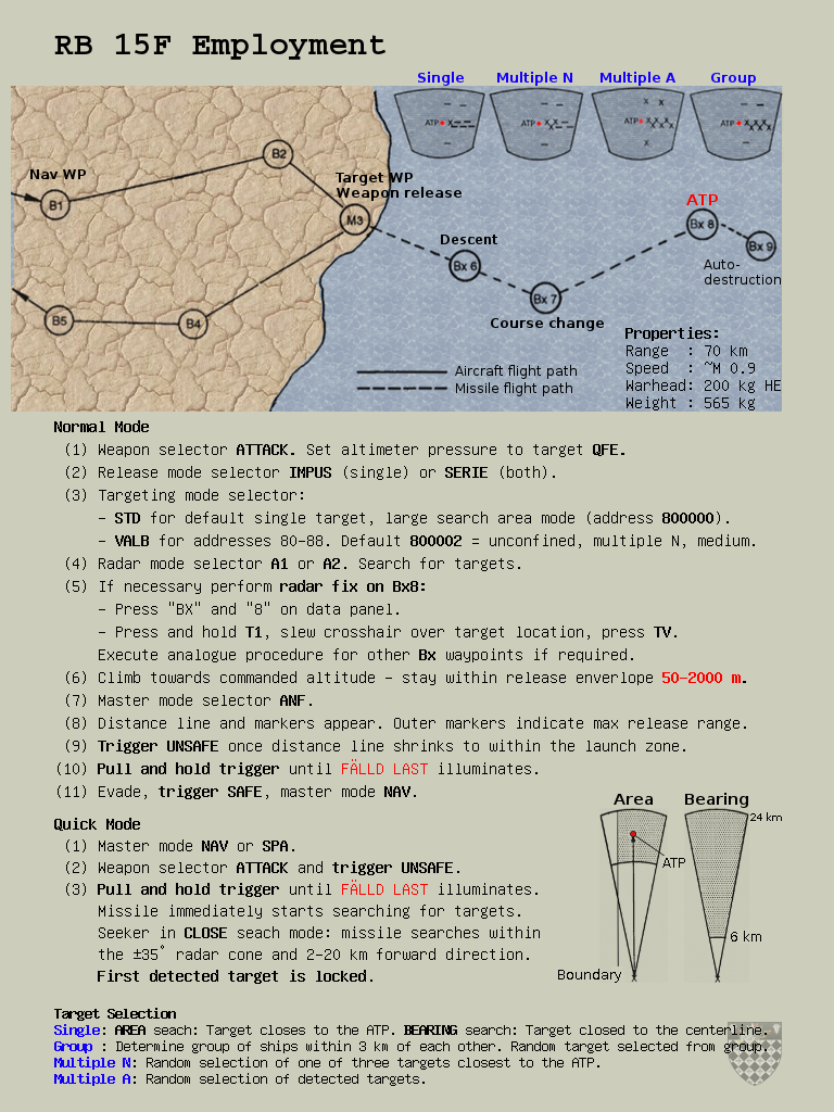 Kneeboard pages covering basic procedures (startup, taxi, take-off, landing) and warfare, i.e. weapons employment (M/71, Lysbomb, BK 90, ARAK/AKAN, RB 04, RB 05, RB 15, RB 75 and RB 24/74) as well as CK37 input/output codes. Furthermore, KB countermeasures and U22/A ECM pod and ELINT pages.