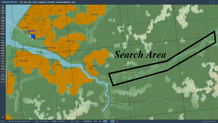 You are the only OV-10A pilot available. You must stop or slow down an approaching insurgent convoy on the valley road headed toward your base. Spot the convoy and plan your attack wisely. Check the map in the screenshot which defines the search area.