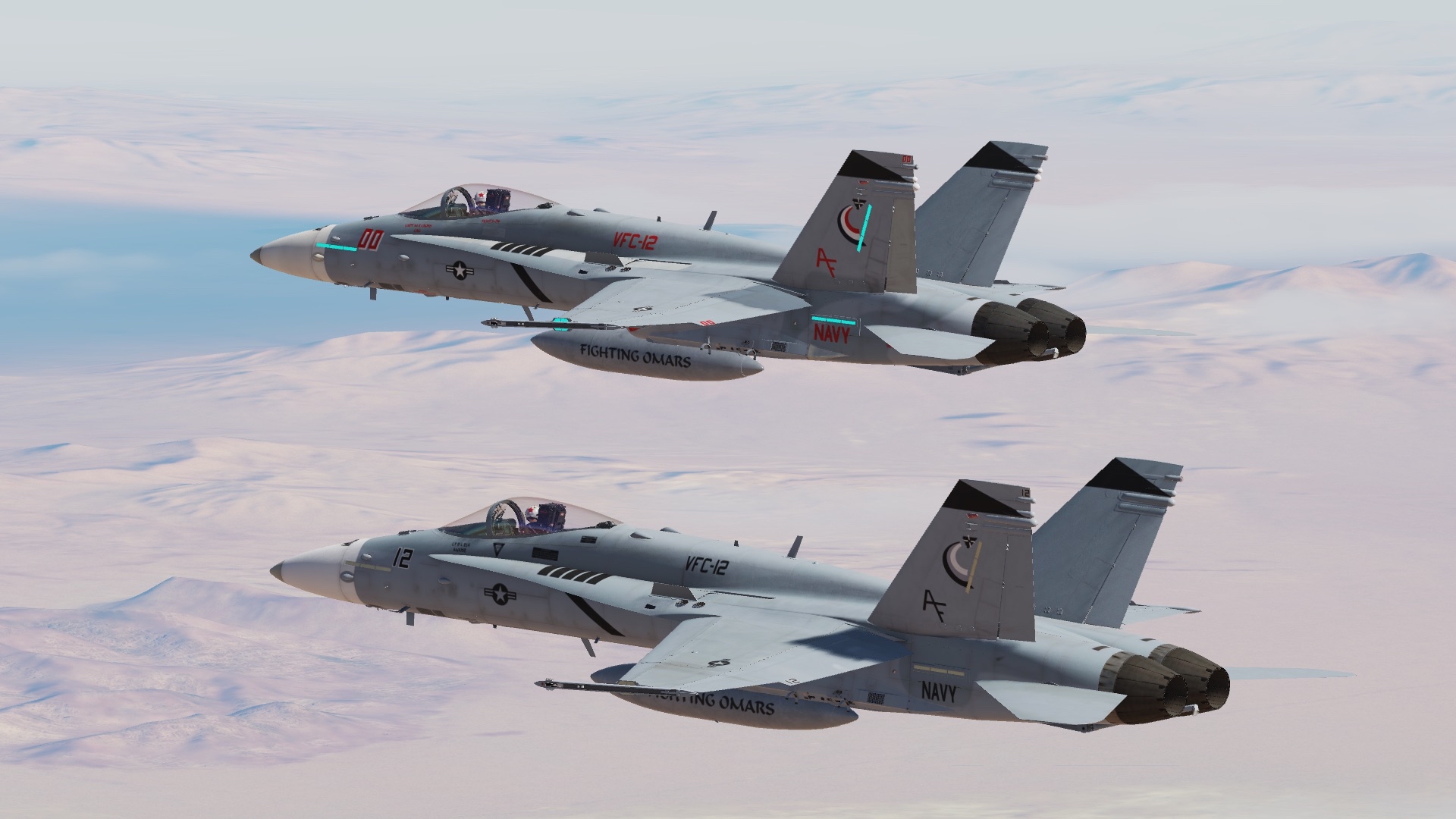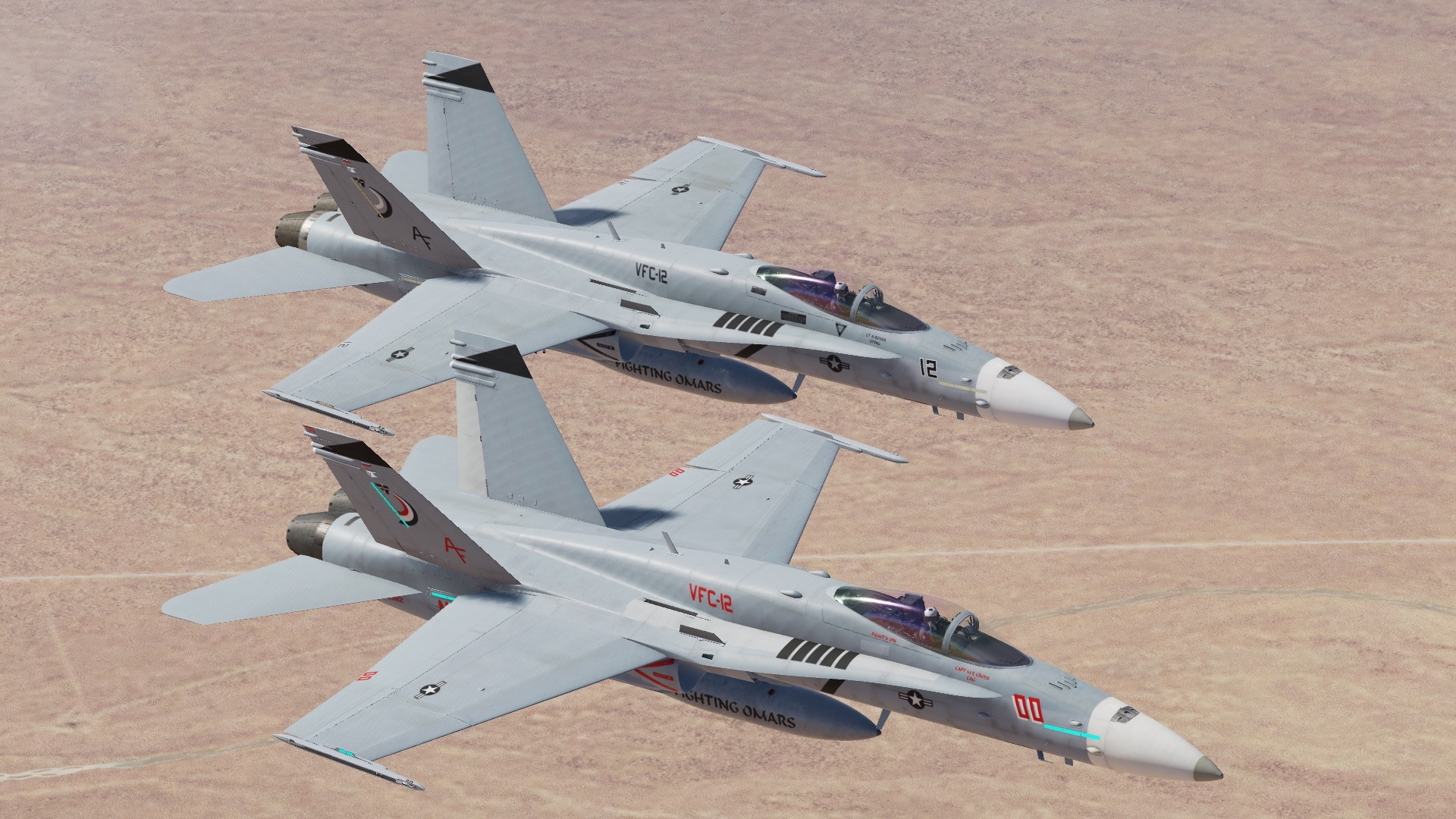 Two skins from VFC-12, the Fighting Omars. 00 is based off a reference image from 2005, and 12 one from 2006. Some light custom weathering, and custom patches and helmets for both aircraft, including roughmets and normal maps; the helmets specifically have had the somewhat scaled sticker effect that's occasionally seen. Place the two .zip files inside VFC-12_pack.zip into CoreMods\aircraft\FA-18C\Liveries\FA-18C_hornet.