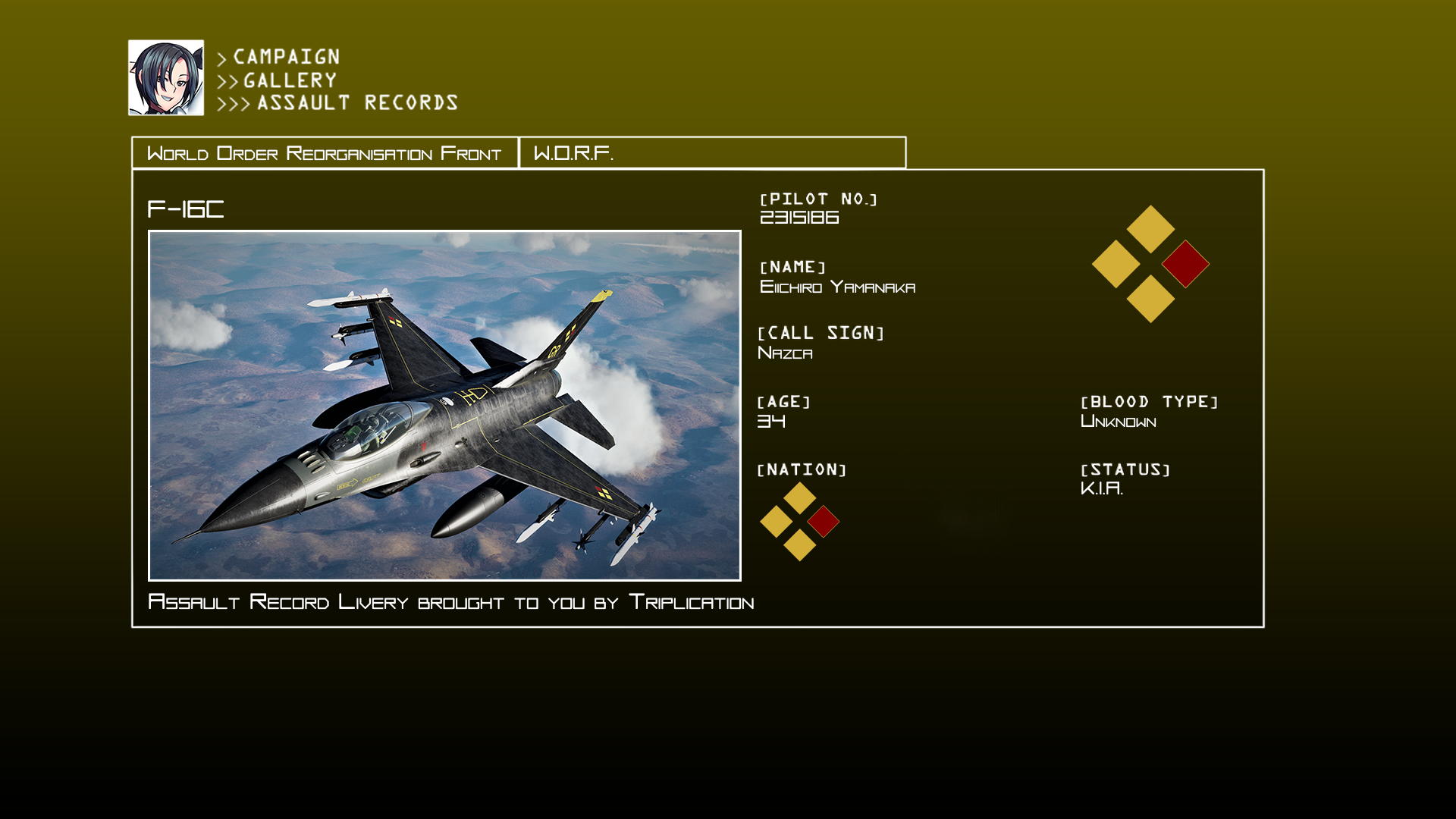 A F-16C livery pack based on a character from Ace Combat 6: Fires of Liberation that goes by the name of Windhover. In the zip you'll find the files for the Windhover skin. Install: drop the files from the ZIP into \DCS World\CoreMods\aircraft\F-16C\Liveries\F-16C_50\ They'll show up as " Ace Combat - Emmerian Air Force Windhover' in the livery selection. If there's any sort of issue with the livery please let me know and ill fix it ASAP!    1.3 Fix:  General Fixes / LUA Fix
