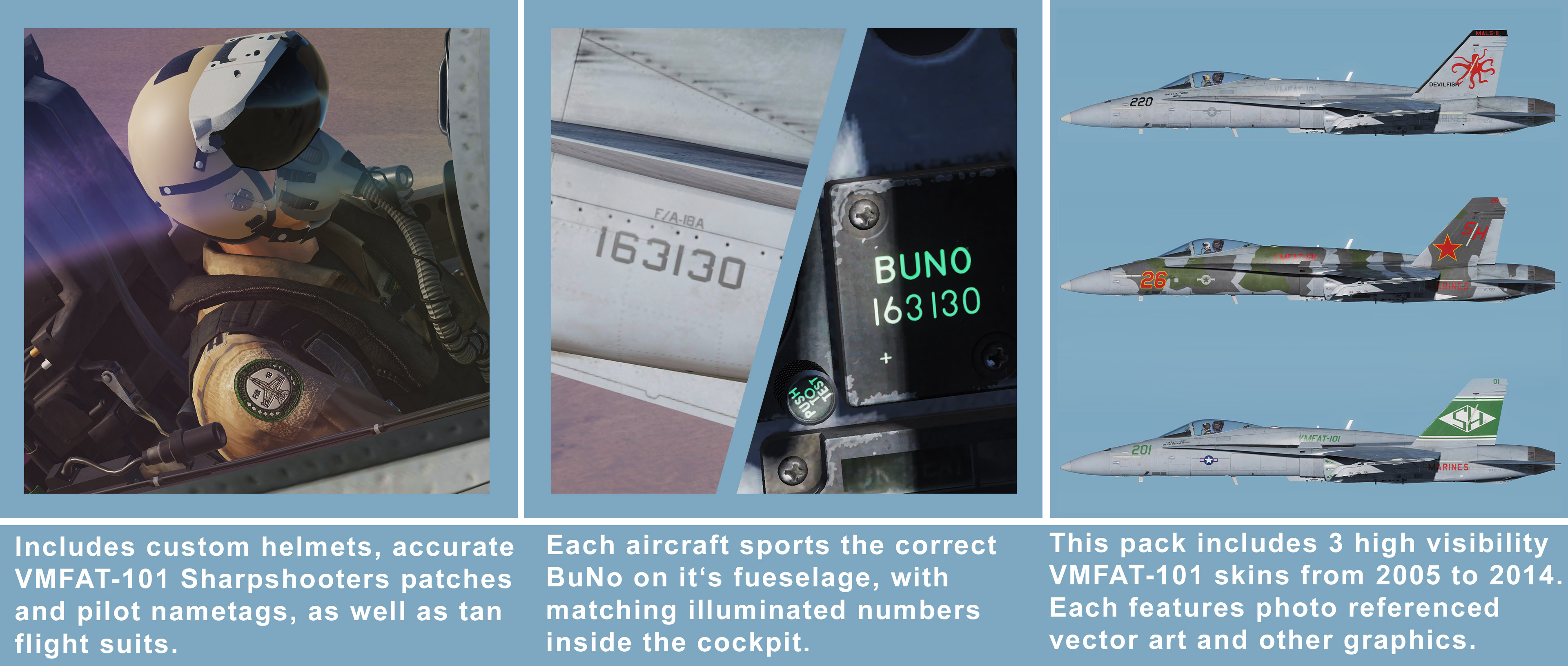 This pack is made up of 3 authentic VMFAT-101 "Sharpshooters" liveries from 2005 to 2014.