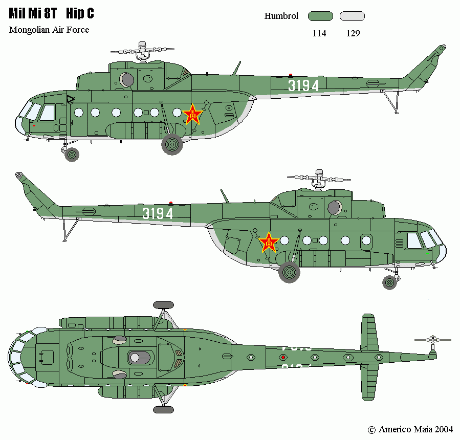 Mongolian Air Force livery for the Mi-8. Colours are exact. Registration number has only three instead of four digits.