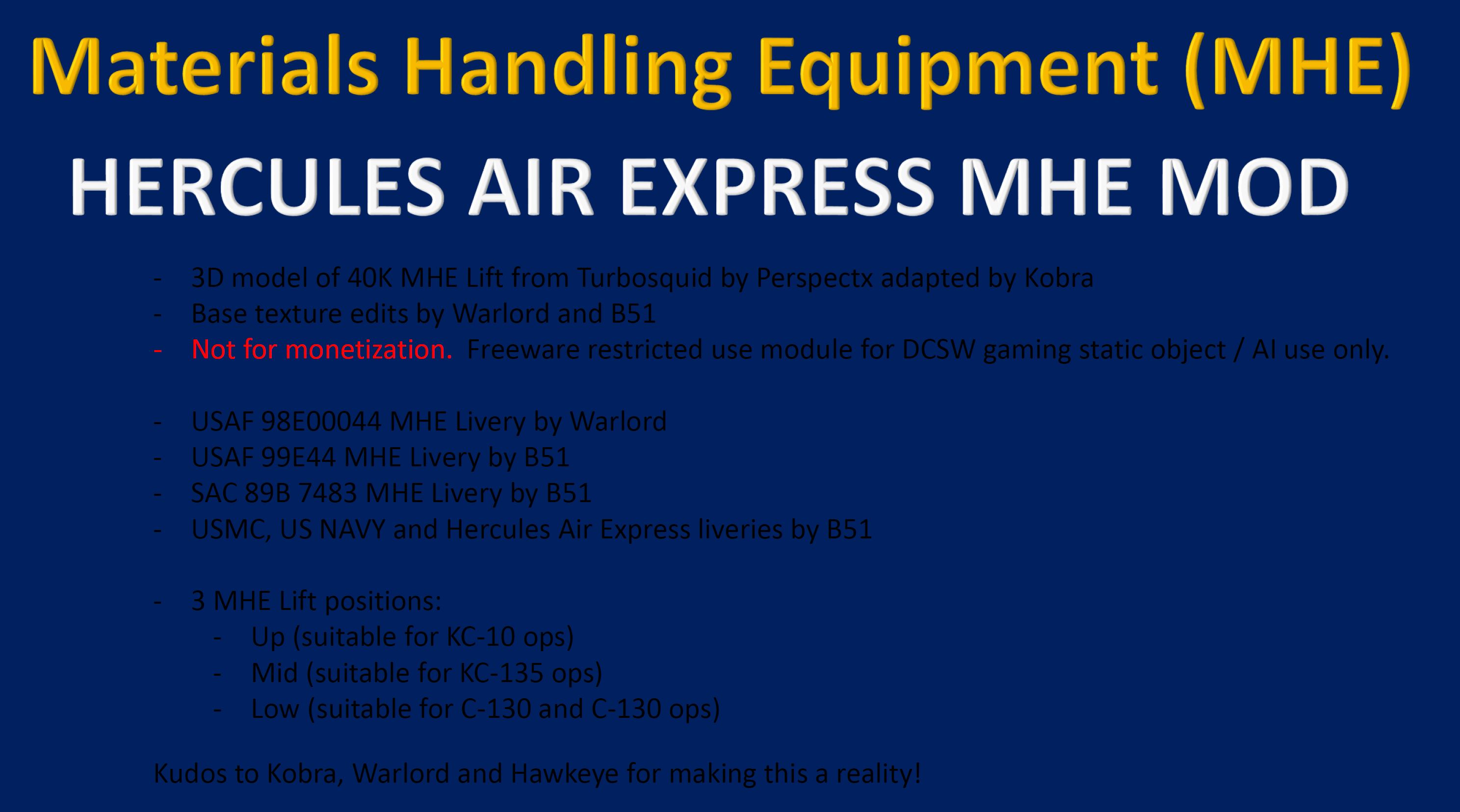 Greetings Herc Aviators - real and imagined!  Thanks goes out to Anubis for the ever improving Hercules Mod! I also extend thanks to Knapsack for insight into the Herc_Cargo_CTLD.lua and Kaptin Kaos for his wise words concerning the CTLD.lua and the enclosed example mission files.  If you need to learn Dedicated Server Ops, Kaos is your man!