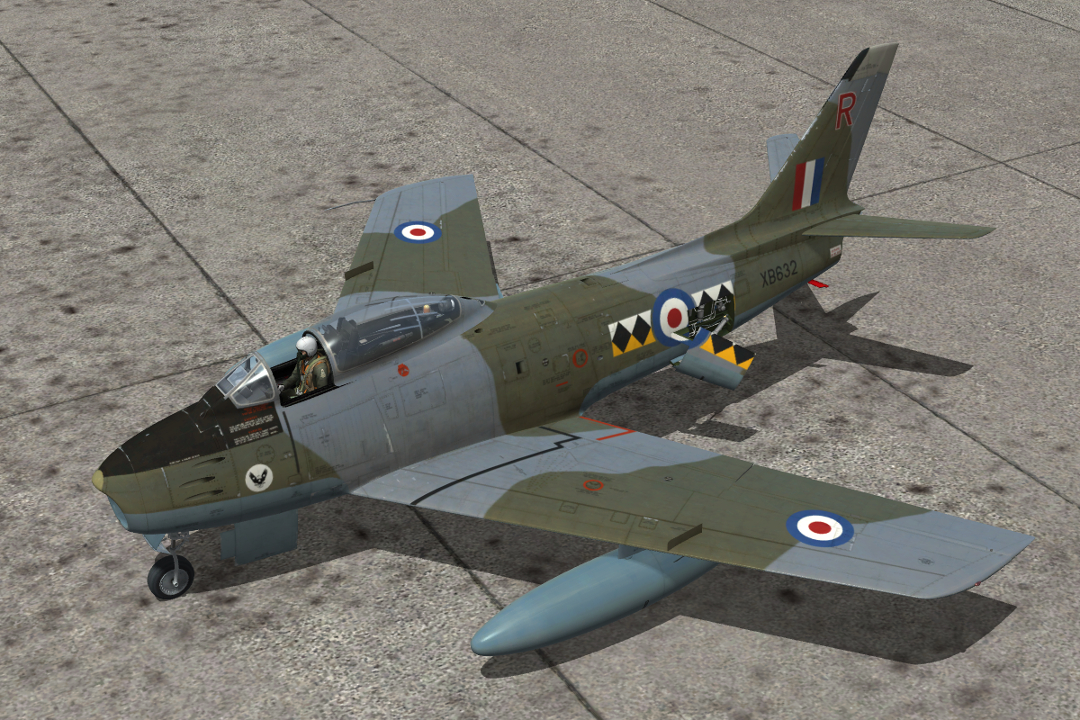 Esq. 51 flew the Sabre well into the 1980s, the aircraft were initially finished in natural metal before being painted in light grey, with only the tail pipe and gun blast panels remaining in natural metal.