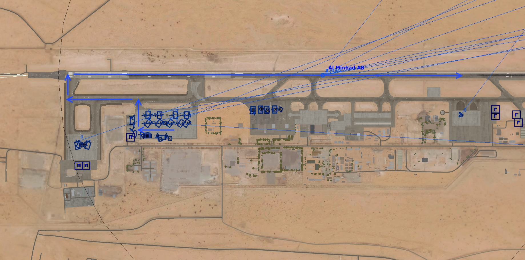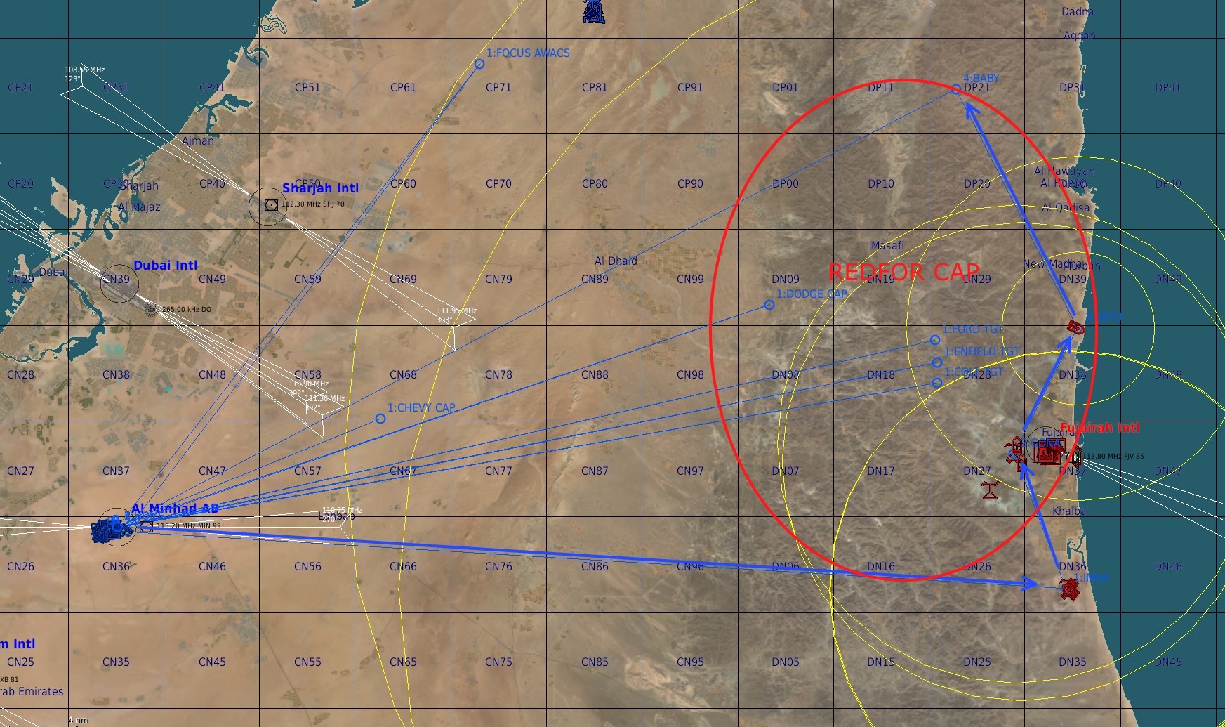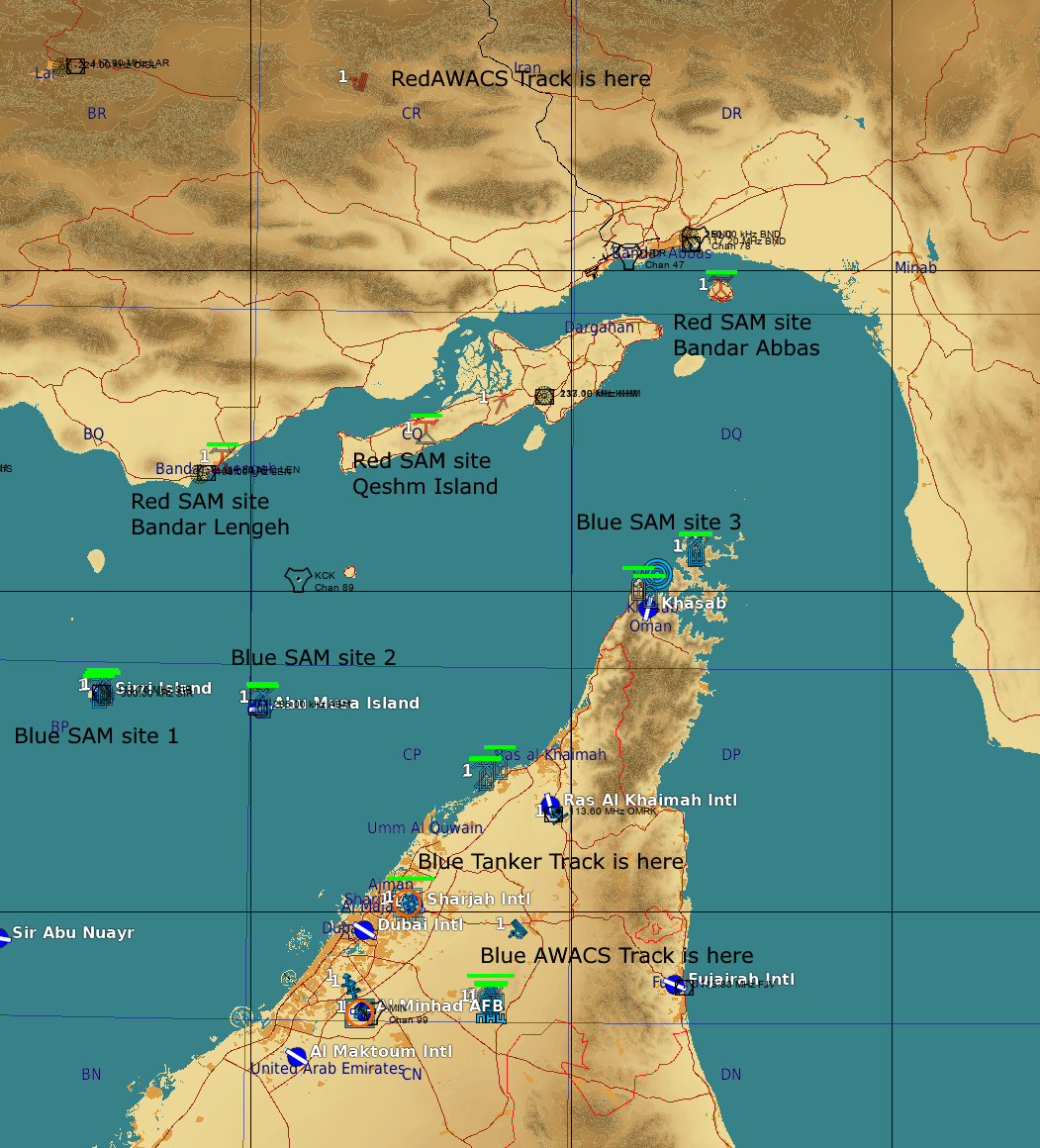At mission start 2 AI F-22s will scramble from Al Minhad towards Iran. After the initial scramble you must fly subsequent intercept missions yourself. As friendly aircraft enter Iranian airspace Iranian Mig-29s will scramble from Bandar Abbas to intercept. Iranian SU-25Ts will also begin SEAD operations against blue SAM sites.