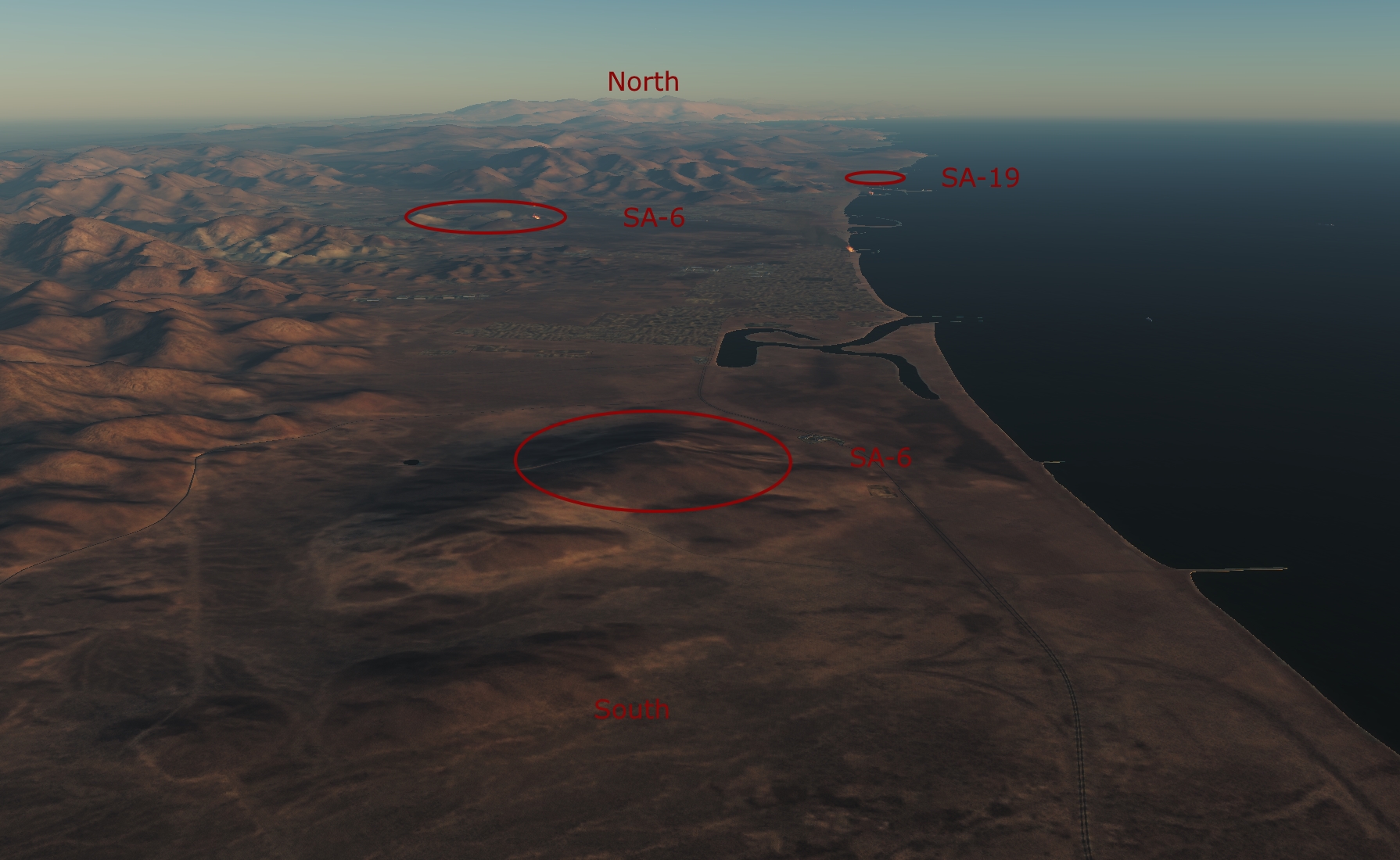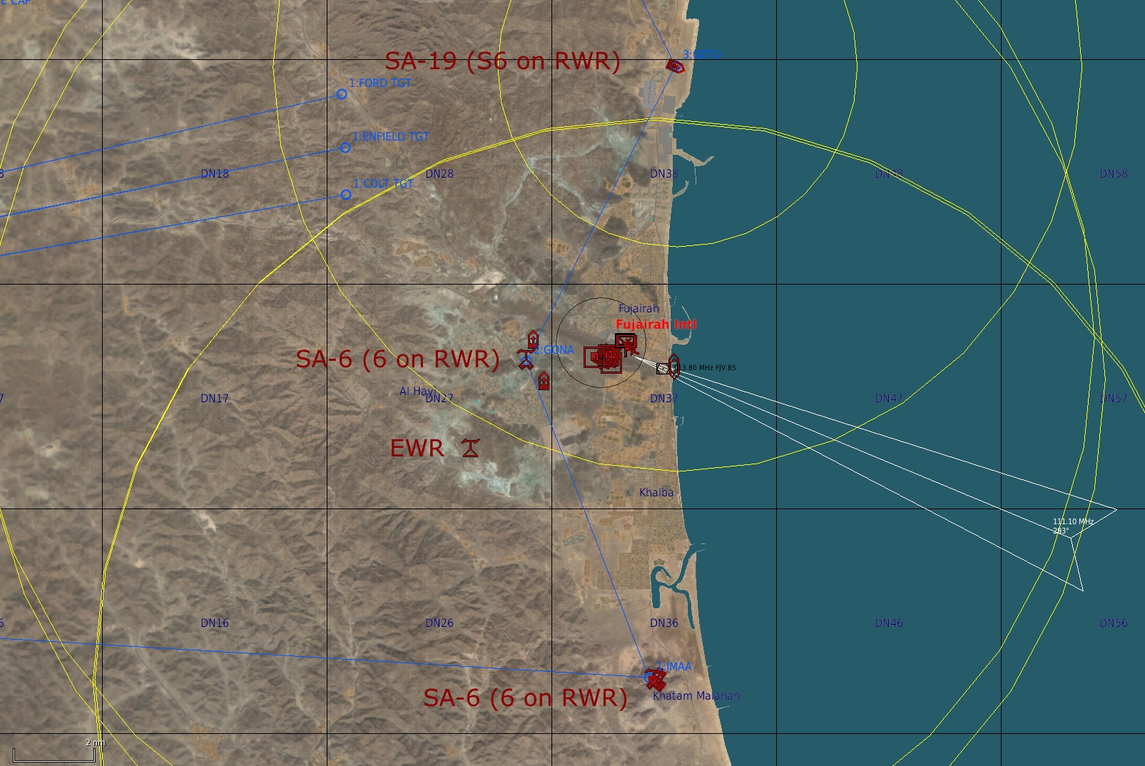 The previous day's raid over Fujairah International Airport severely reduced REDFORs ability to defend the area from further air attacks. Today's mission starts with you, Pontiac 1-1, launching from Al Minhad AB and proceeding west to destroy two SA-6 radars (6 on RWR) and one SA-19 Tunguska (S6 on RWR). A SA-8 (8 on RWR) is located in the airport area although its precise location is unknown.