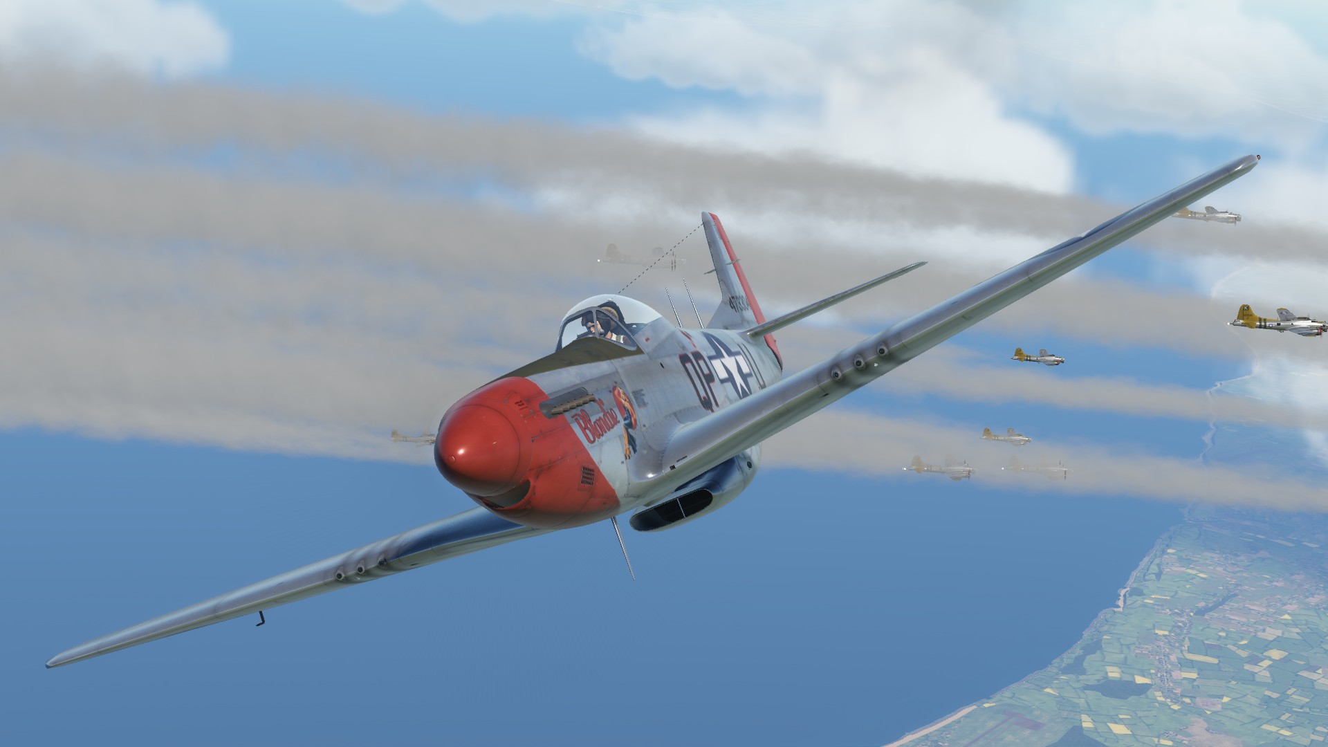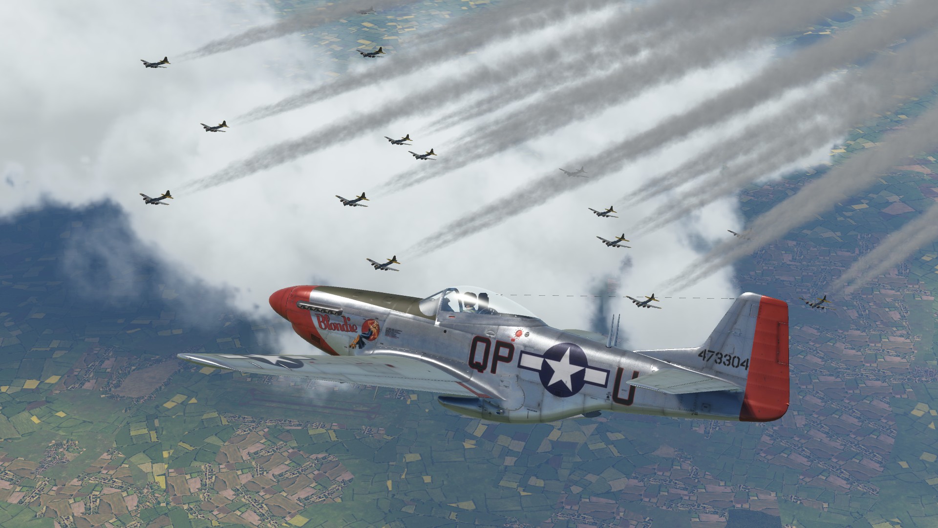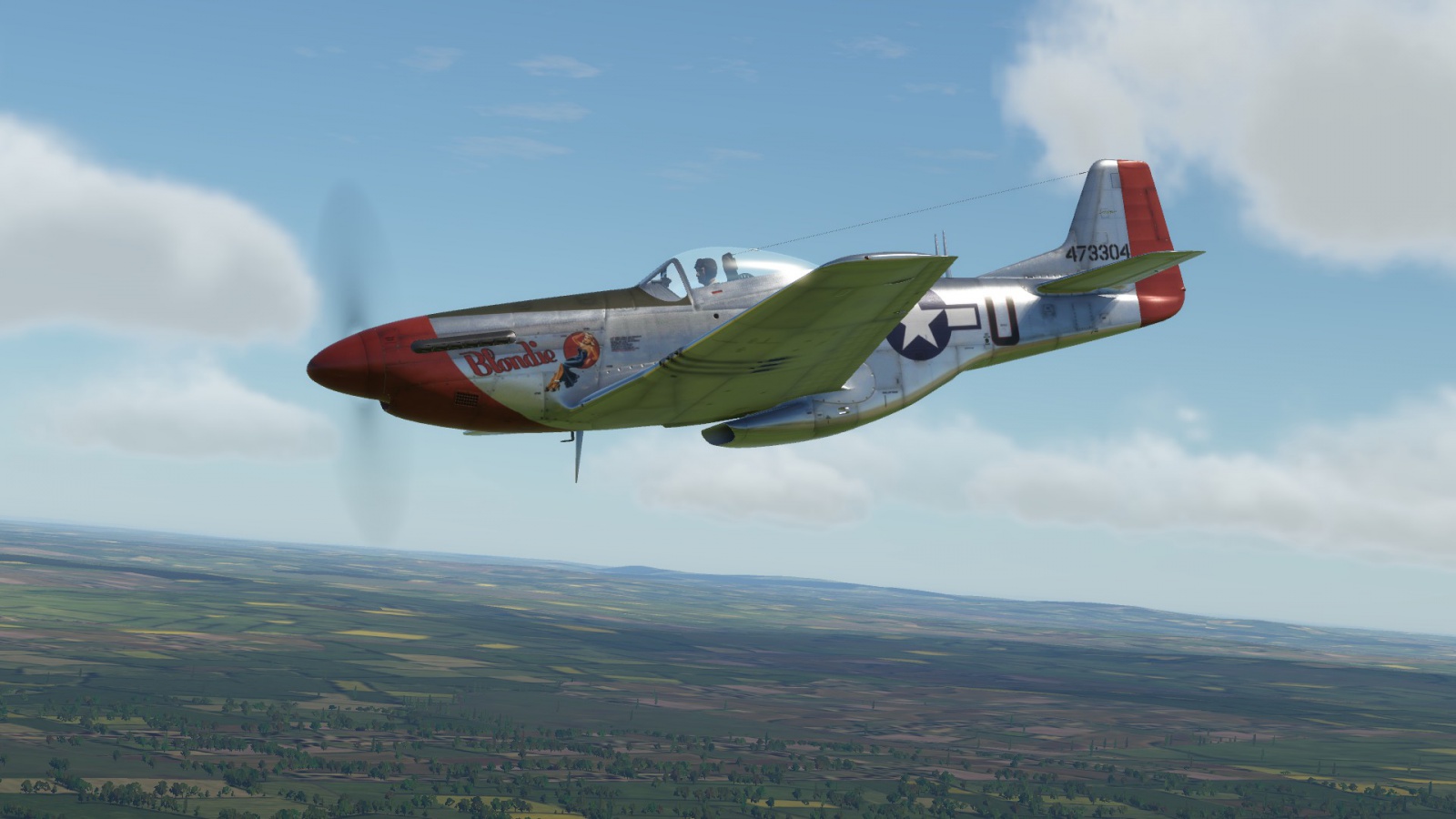 P-51 D Mustang 'Blondie', 334th FS, 4th FG. WW2 era pilot with appropriate patches included. Based on Wiplash's template.<br />