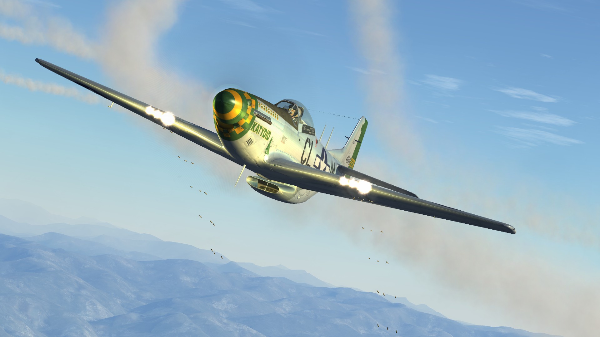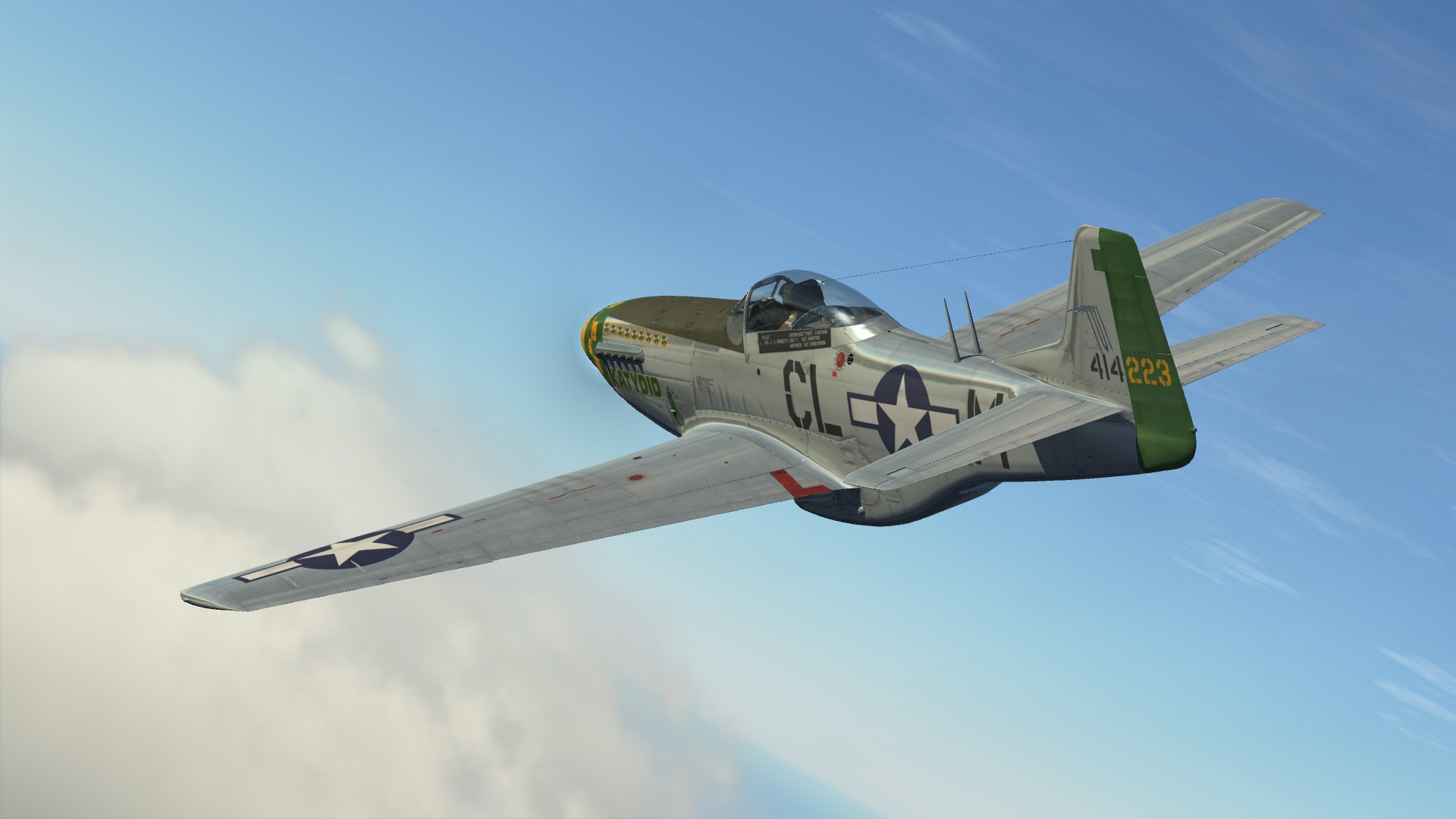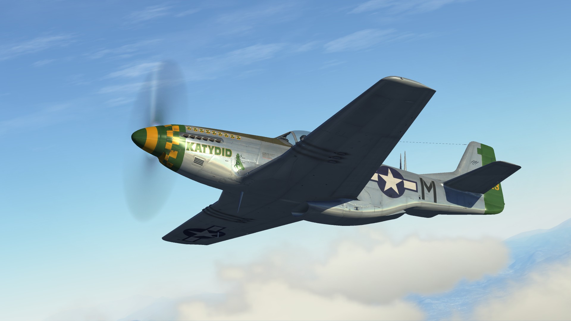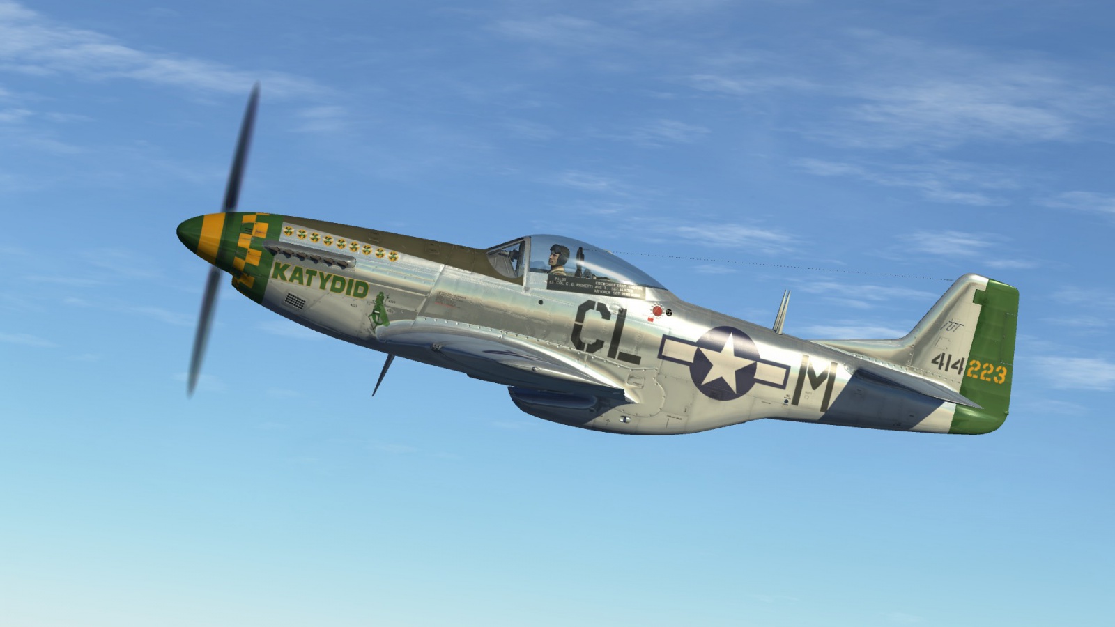 P-51 D Mustang 'Katydid' flown by Lt Col. Elwyn Guido Righetti, 338th FS, 55th FG. WW2 era pilot with appropriate patches included. Based on Wiplash's template.