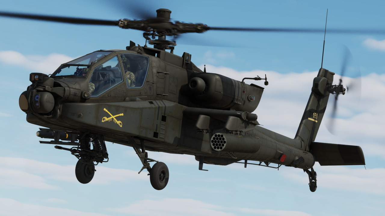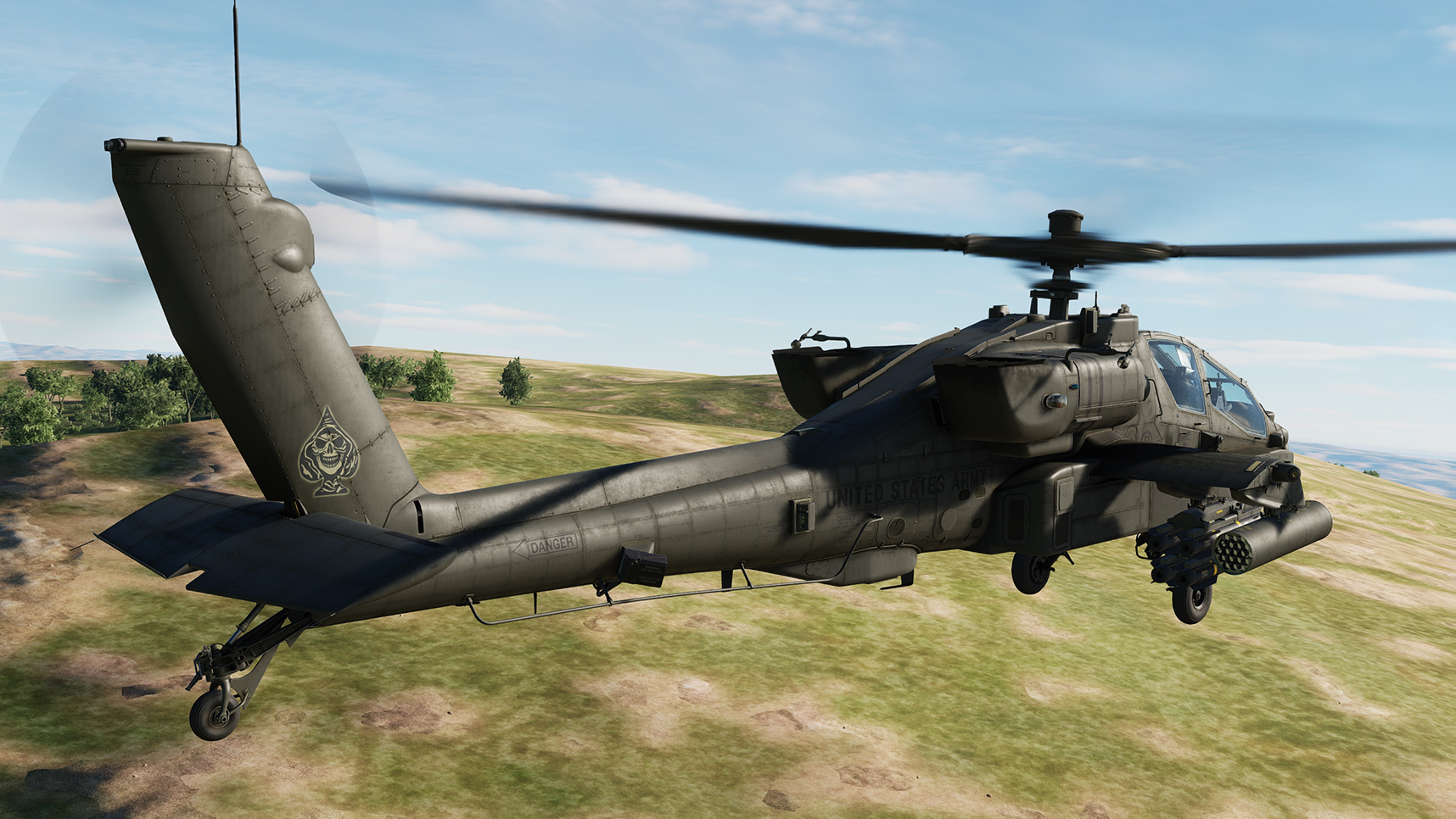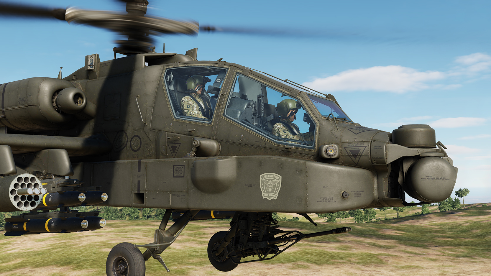 A generic AH-64D from A Co. 1-101st CAB. The pilot and CPG are wearing OCPs instead of the default ACU pattern and have 101st Airborne Patches on both sleeves denoting unit of current assigment and "combat patch". 1-101 Decals are semi-glossy as they are IRL and the tail "spectre" is subdued and has a spraypainted appearance.