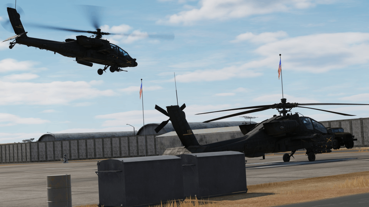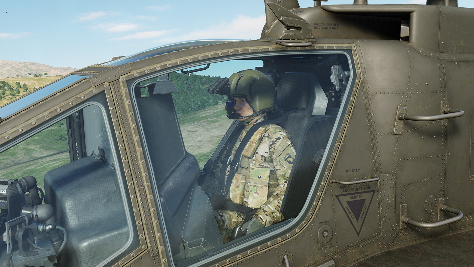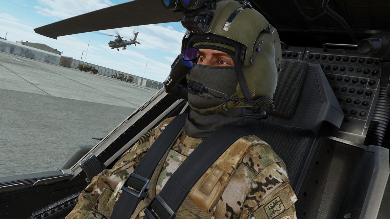 A generic AH-64D from A Co. 1-101st CAB. The pilot and CPG are wearing OCPs instead of the default ACU pattern and have 101st Airborne Patches on both sleeves denoting unit of current assigment and "combat patch". 1-101 Decals are semi-glossy as they are IRL and the tail "spectre" is subdued and has a spraypainted appearance.