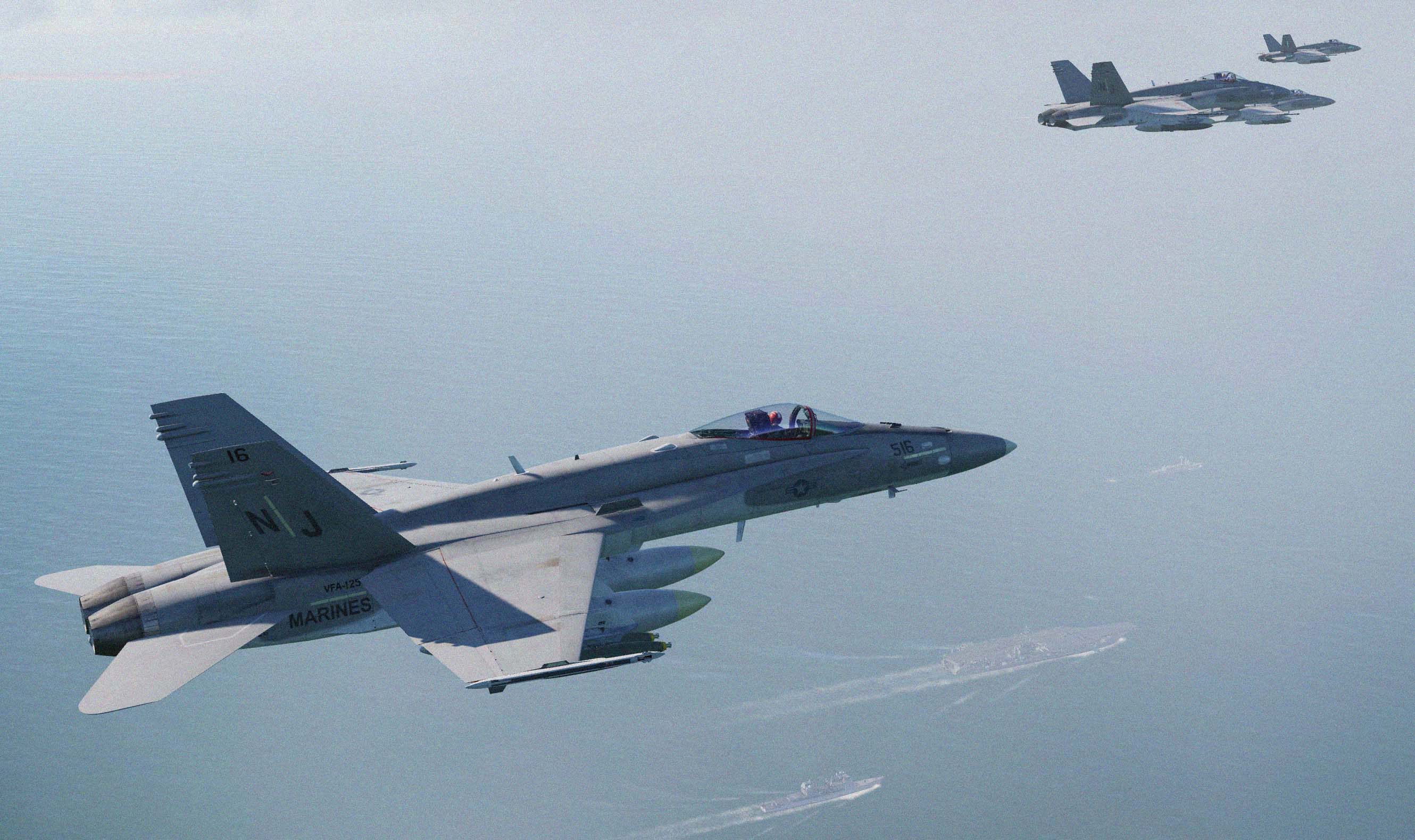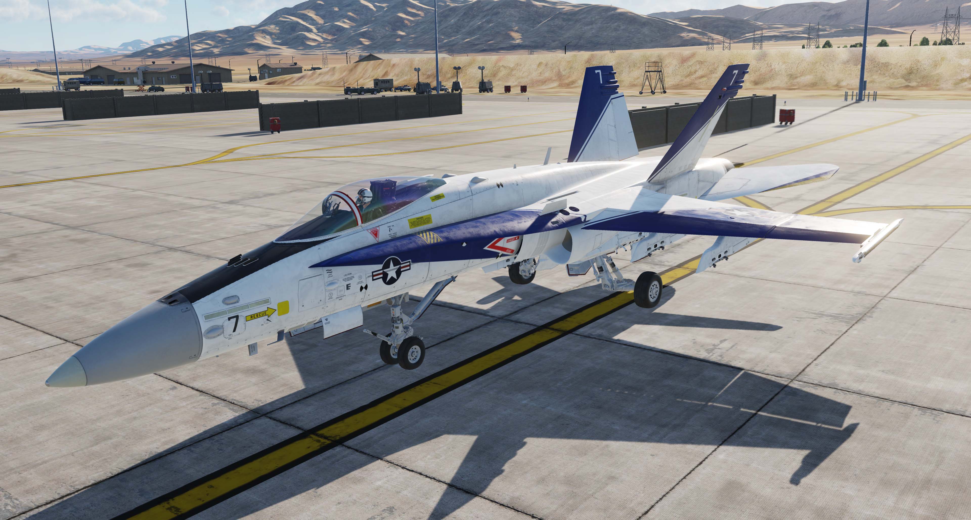 Early Hornet livery from the 1980s two color scheme.  These are examples from VFA-125, Navy and Marines combined new pilot training/qualification squadron.  BORT Numbers are not active in these.  Set includes 500, 501, 514, 515, 516, 553 with correct BuNo based on at least one photo found for each board number. Has visor and helmet from 1980s Hornets.