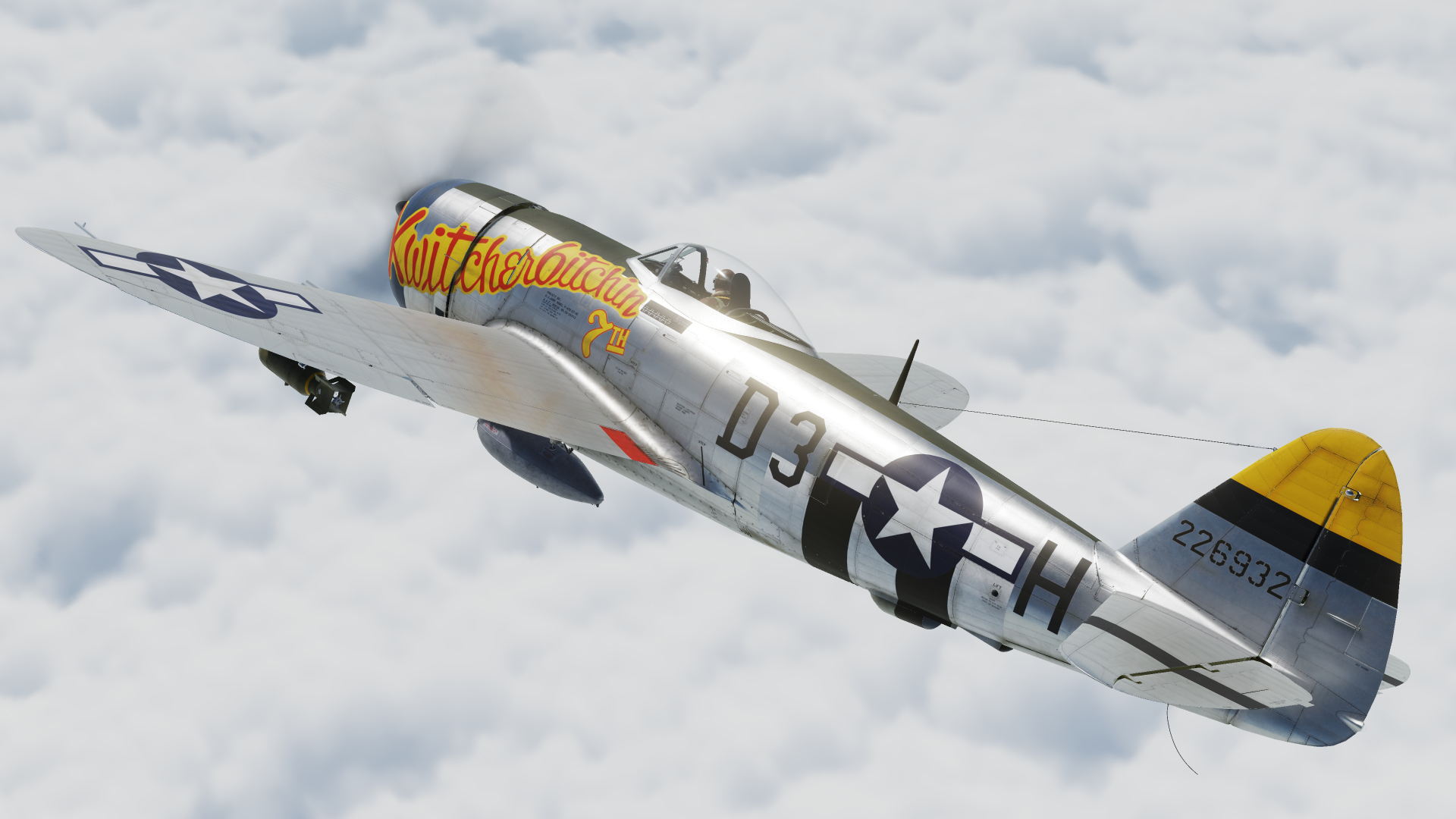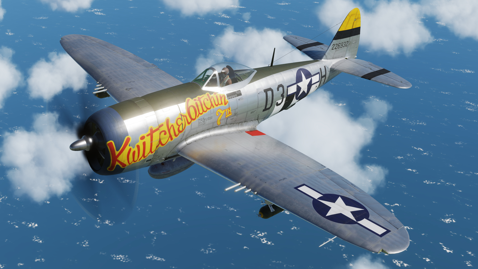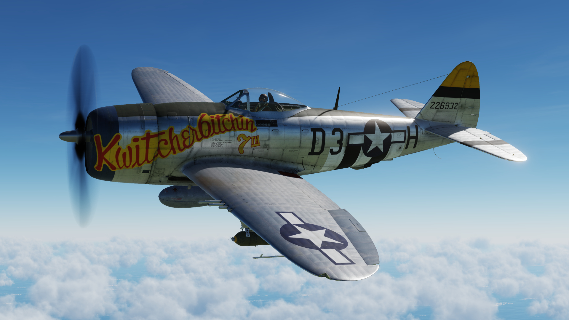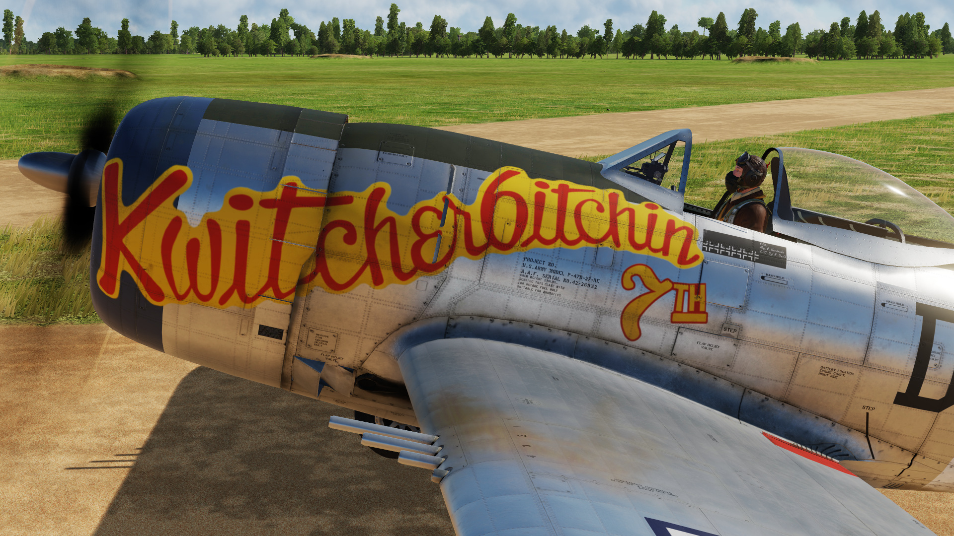 "Kwitcherbitchin 7th" was a P-47D-27-RE flown by Major Randall "Pinky" Hendricks, of the 368th Fighter Group, 397th Fighter Squadron, 9th Air Force.