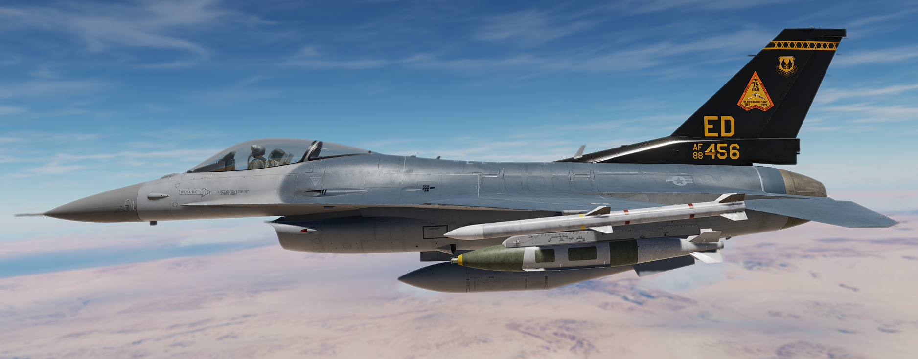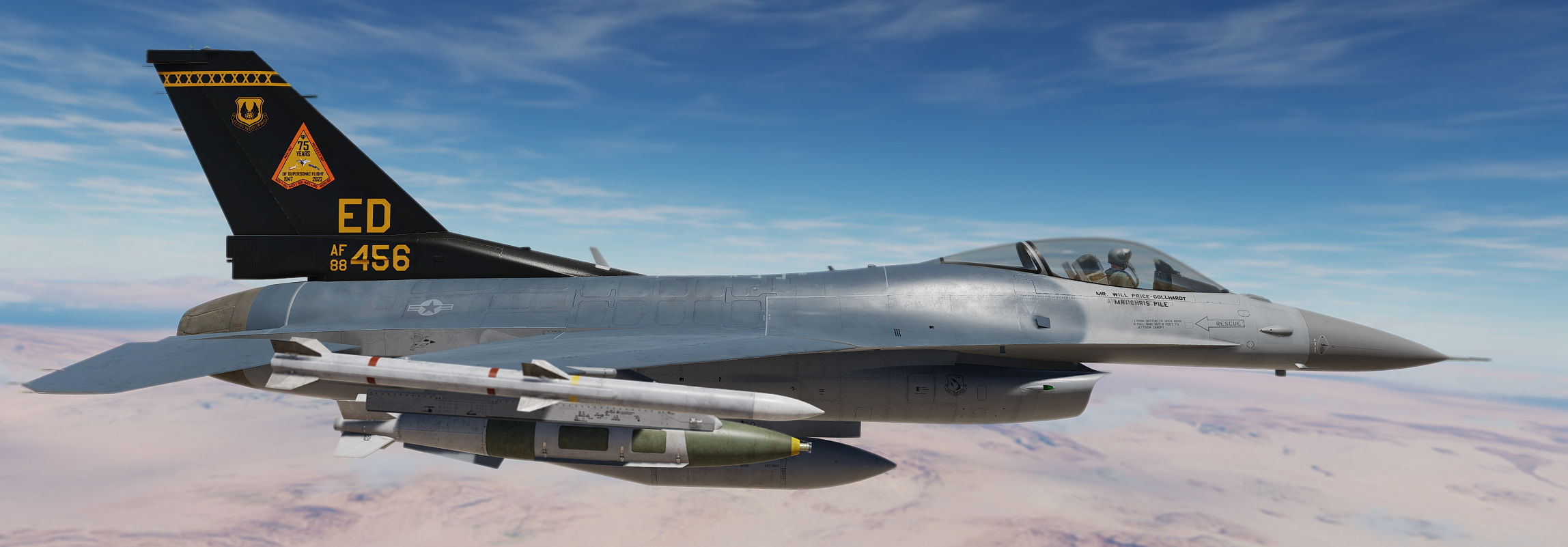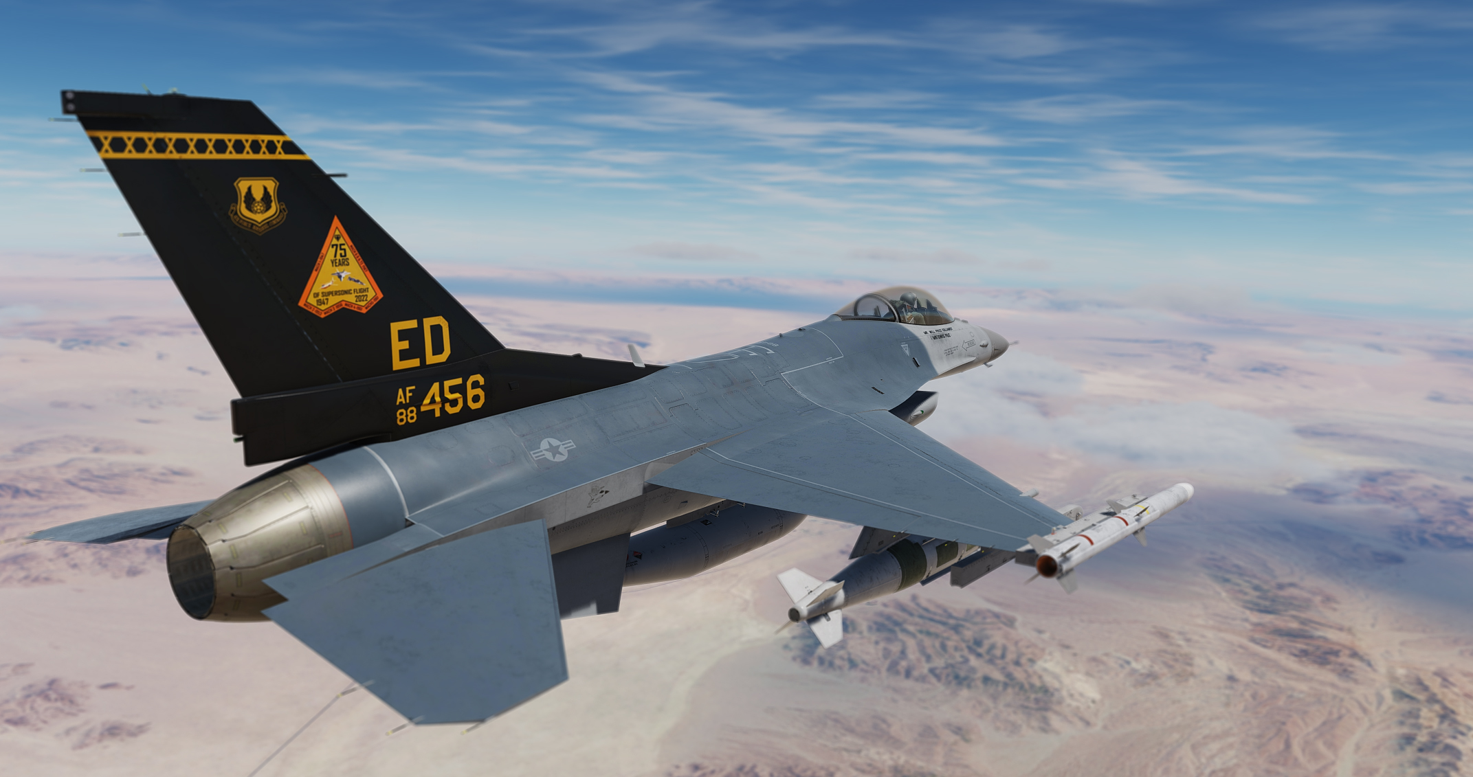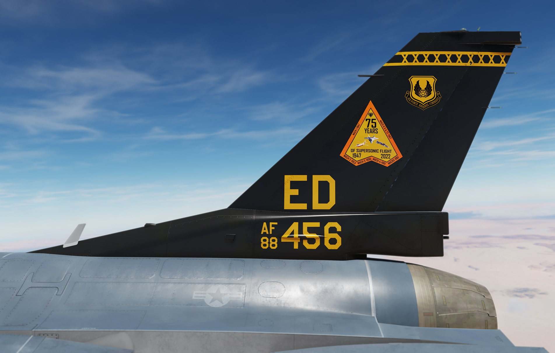 88-0456 is a F-16C Block 42 assigned to the 416th Flight Test Squadron at Edwards Airforce Base.  This commemorative "75 Years of Supersonic Flight" hi vis paint scheme was applied to 88-0456 for the 2022 Aerospace Valley Open house at Edwards Air Force Base.