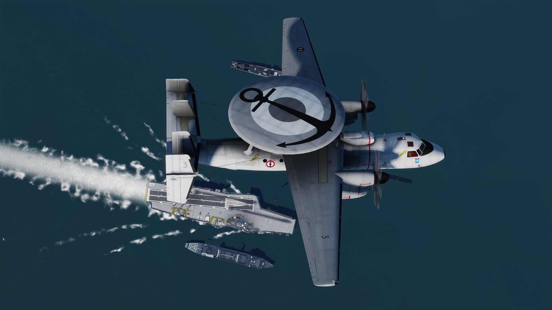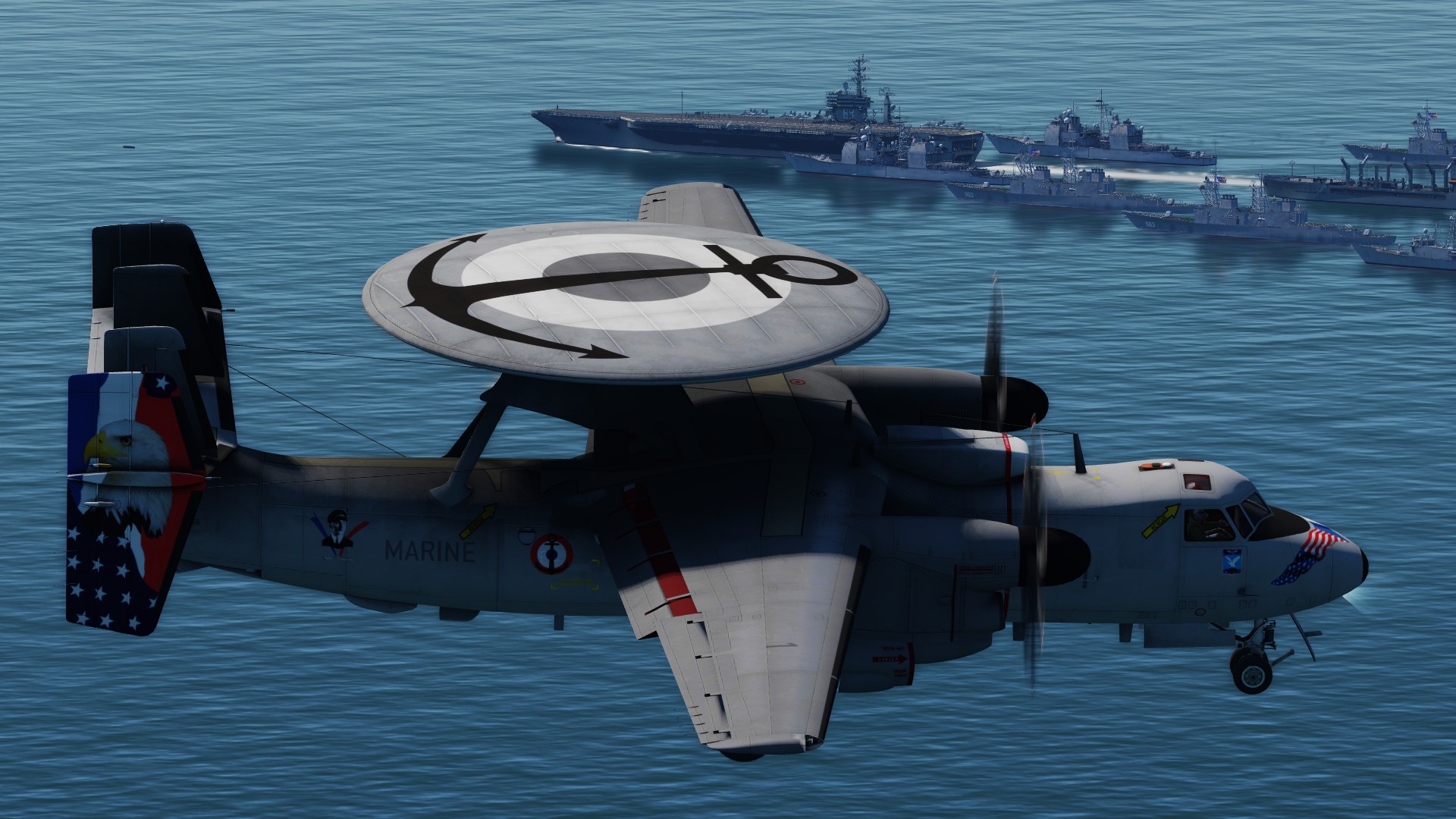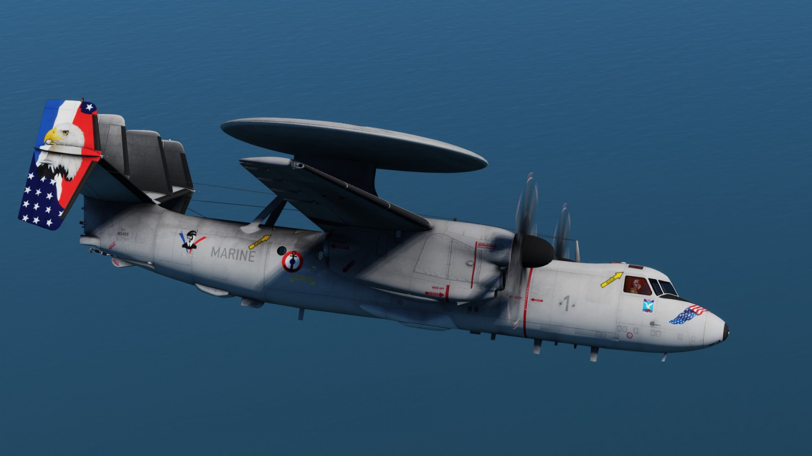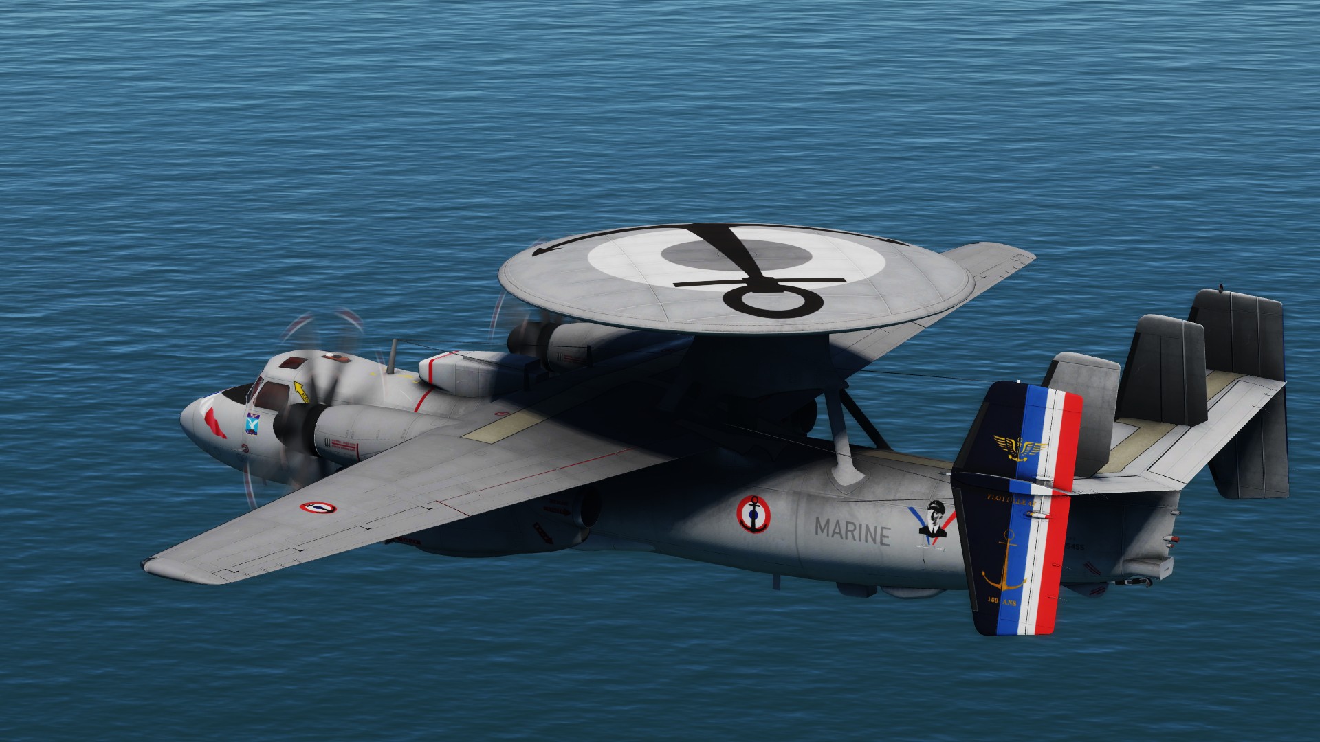 Special (real) decoration worn by French Navy Hawkeye in April May 2018: For the 100 years of the Flotille 4F, and on the occasion of the French Groupe Aéronaval to operate for two months in the US while the Charles de Gaulle carrier is under maintenance and MLU.