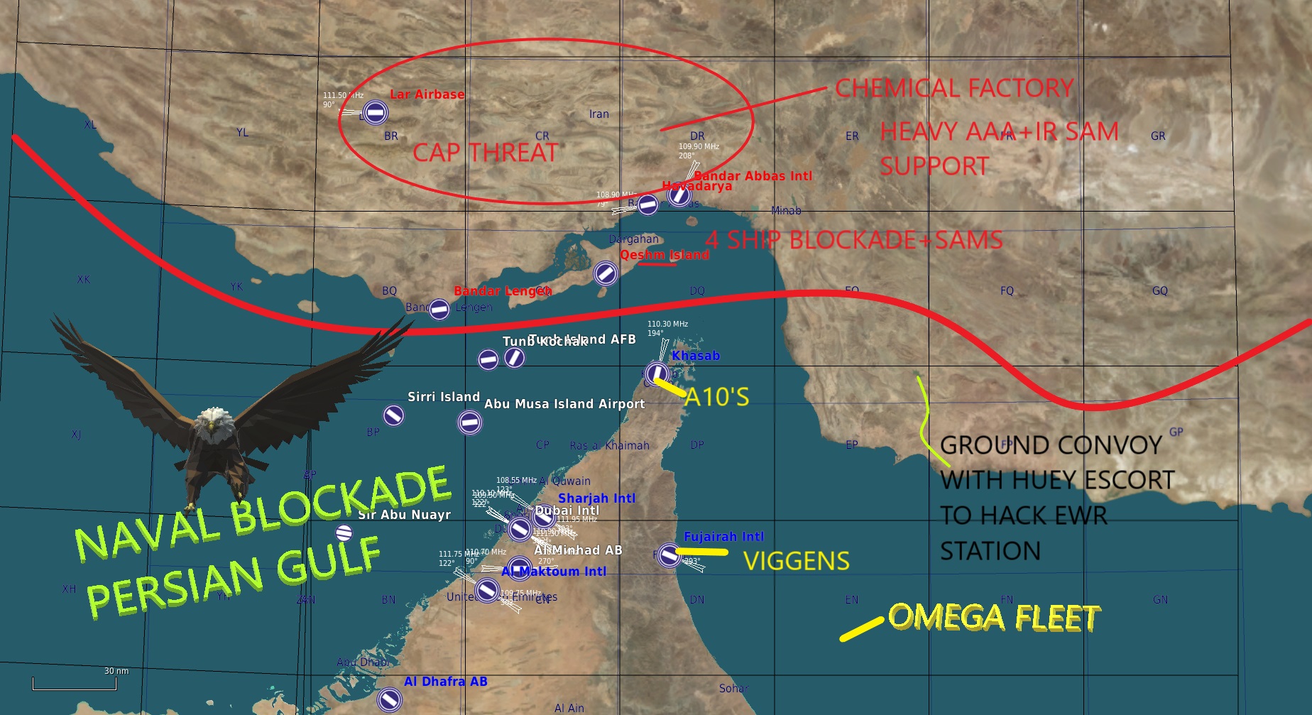 Omega fleet have arrived at the Persin Gulf, A combined strike from multiple squadrons has been planned, to neutralise the enemy sea, air and ground threat, and destroy there chemical wepaons factory. A 4 ship blockade is protecting the straight from any of our jets pushing through,  we have a spec ops team driving to there EWR station to cut any advanced warning of us coming,