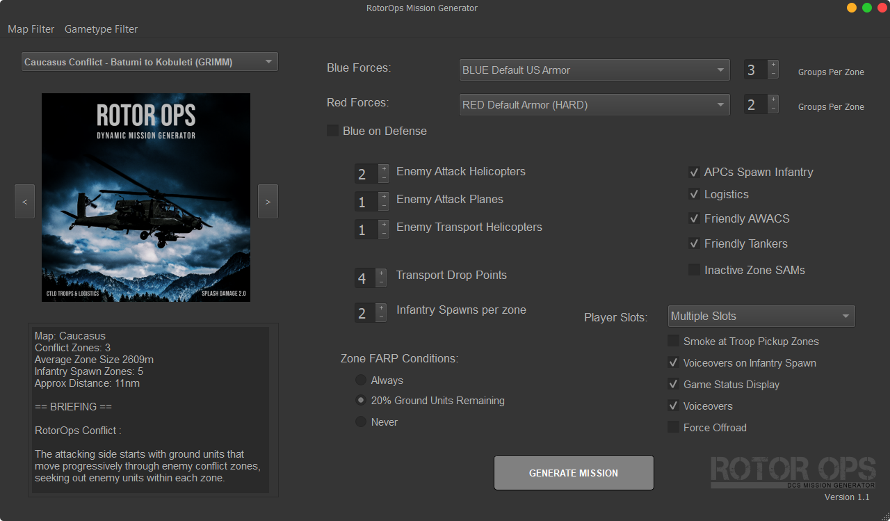 RotorOps is a mission generator and gameplay script for DCS: World. At its heart is a game type called Conflict, which requires helicopter operations to win battles on the ground. AI enhancements provide a dynamic ground war by causing unscripted conflicts between ground forces and a progression of the front line.