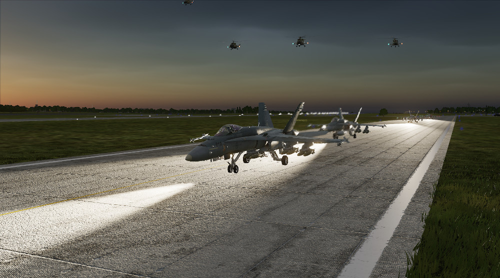 A surprise attack on Sochi-Alder airbase has been authorized. Georgian Special Forces will be inserted via helicopter to attack the base from the North and the East. A massive artillery barrage has already severely damaged the airbase. Your flight of 4 F18s will strike the base ahead of the ground forces as a diversion. 2 F16 flights perform SEAD actions in support.
