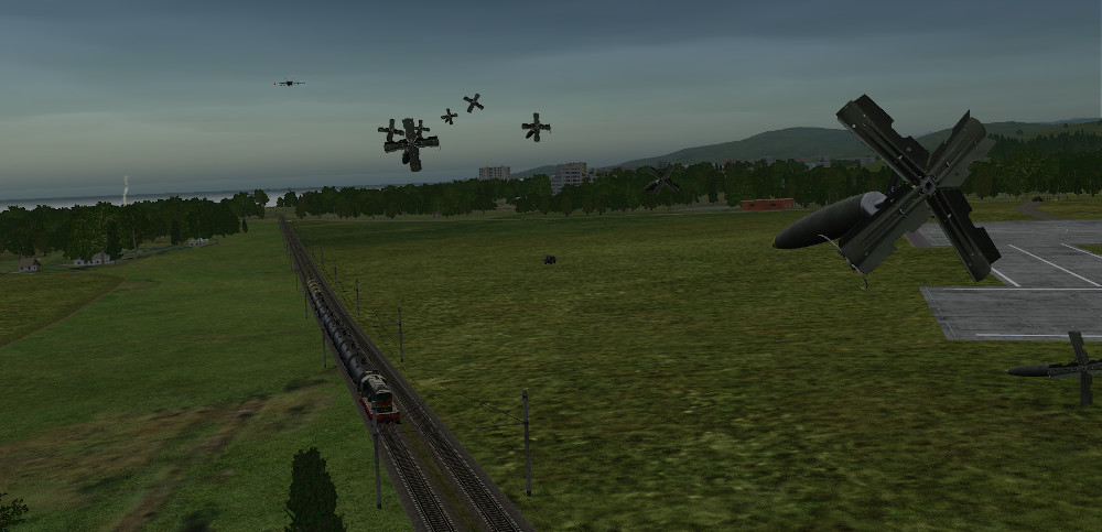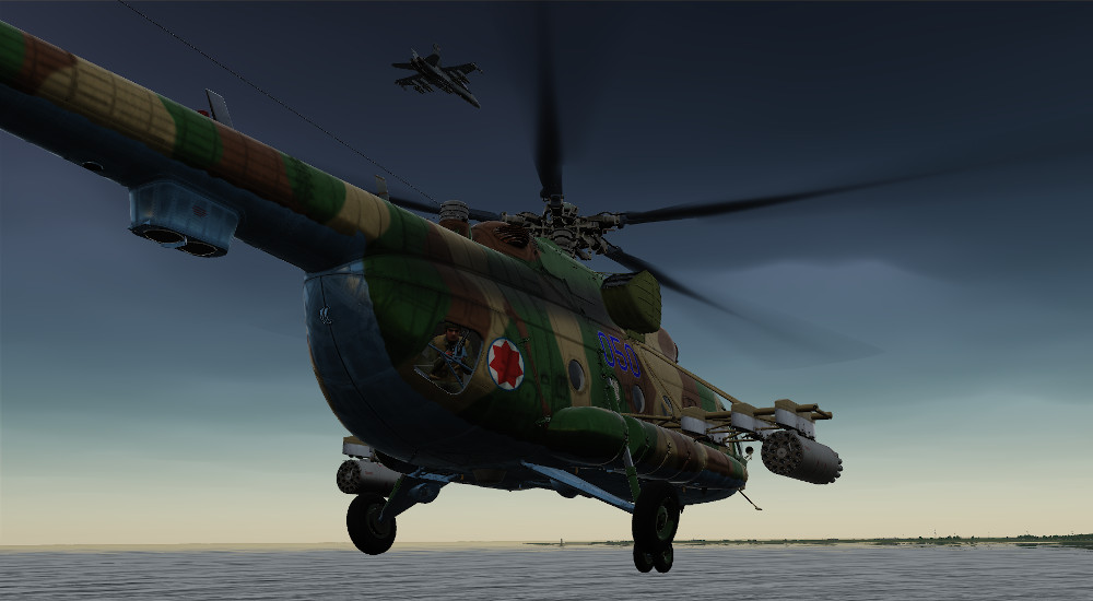 30 miles ahead of you sit 8 Enemy units along the Pashkovsky Coast & two Black Sharks are orbiting above.