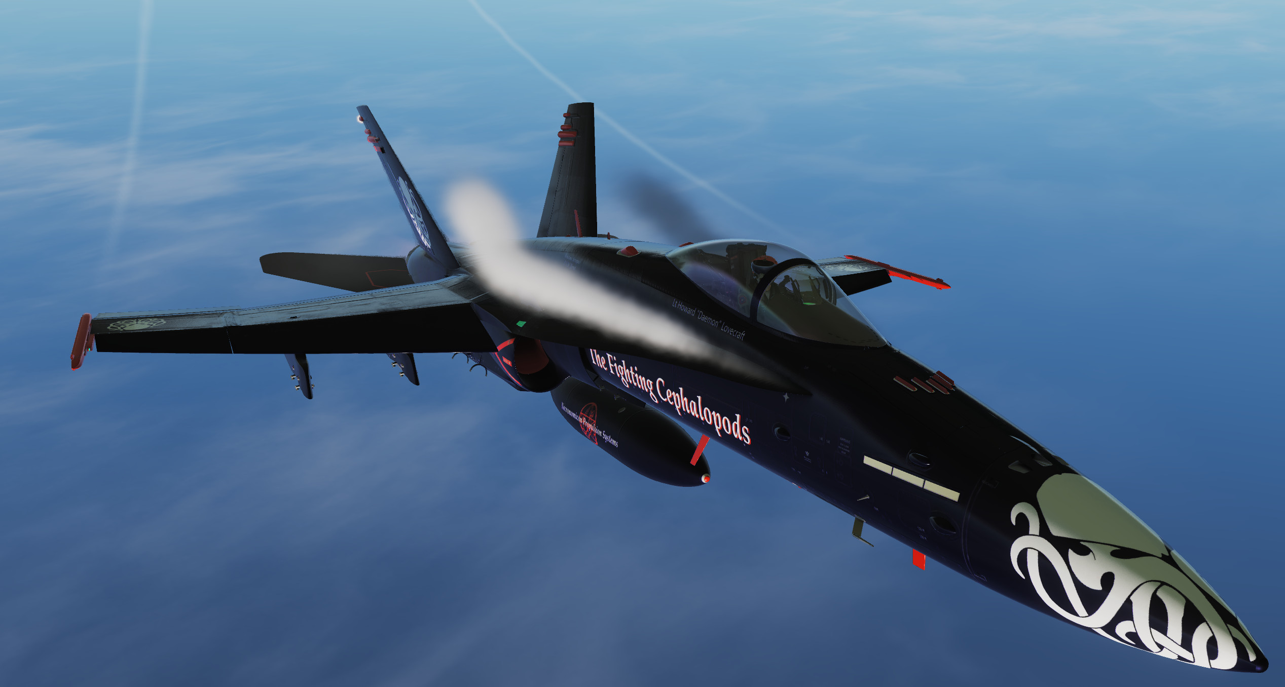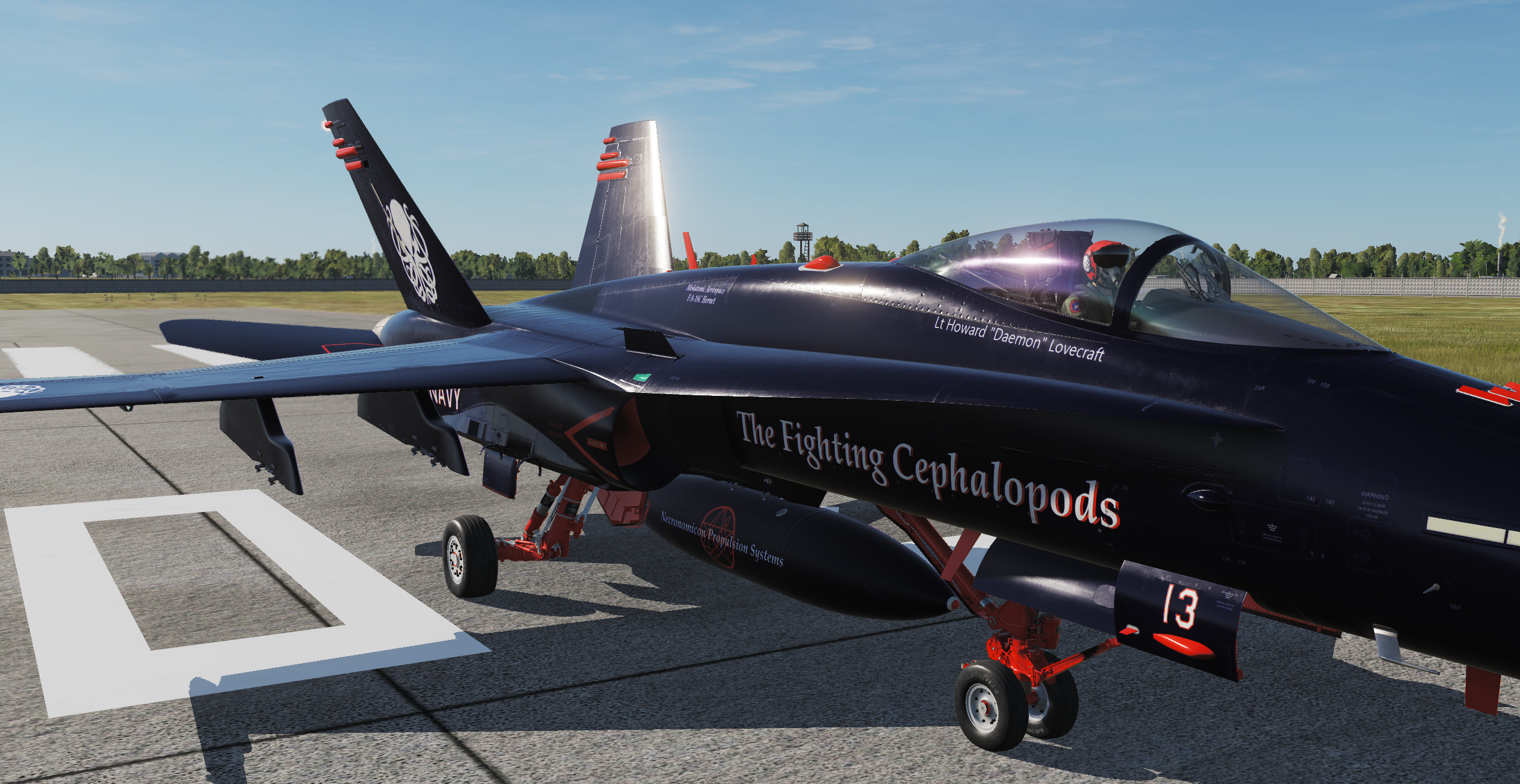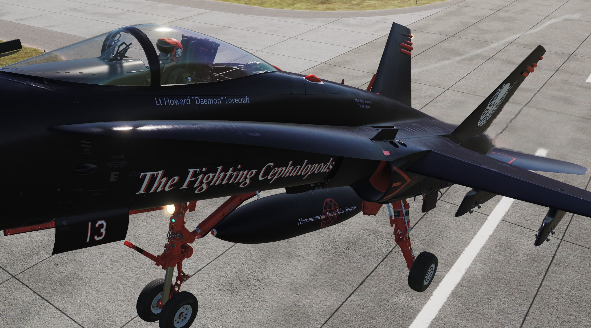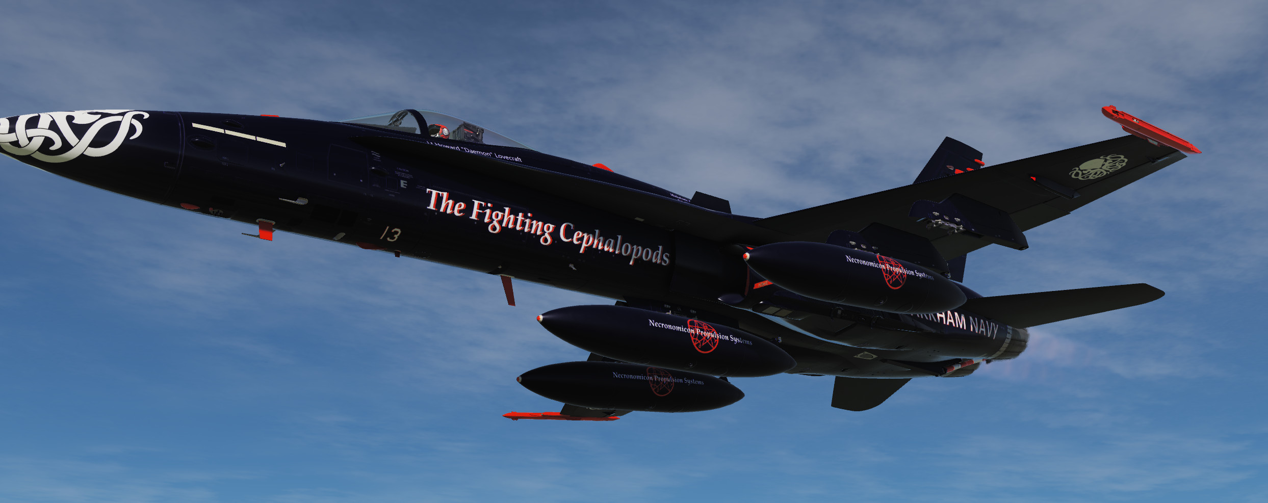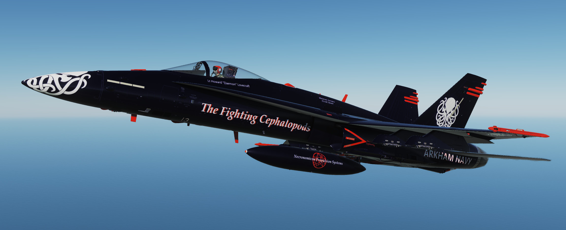 From the Cthulhu logo on the tail, nose, wings, pilot helmet and patch, to the Arkham Navy registration, "The Fighting Cephalopods" squadron is ready to take on all threats.  Fly the personal F/A-18C Hornet of Lt Howard "Daemon" Lovecraft specially built by Miskatonic Aerospace and lead the way to victory in this dimension or any other!