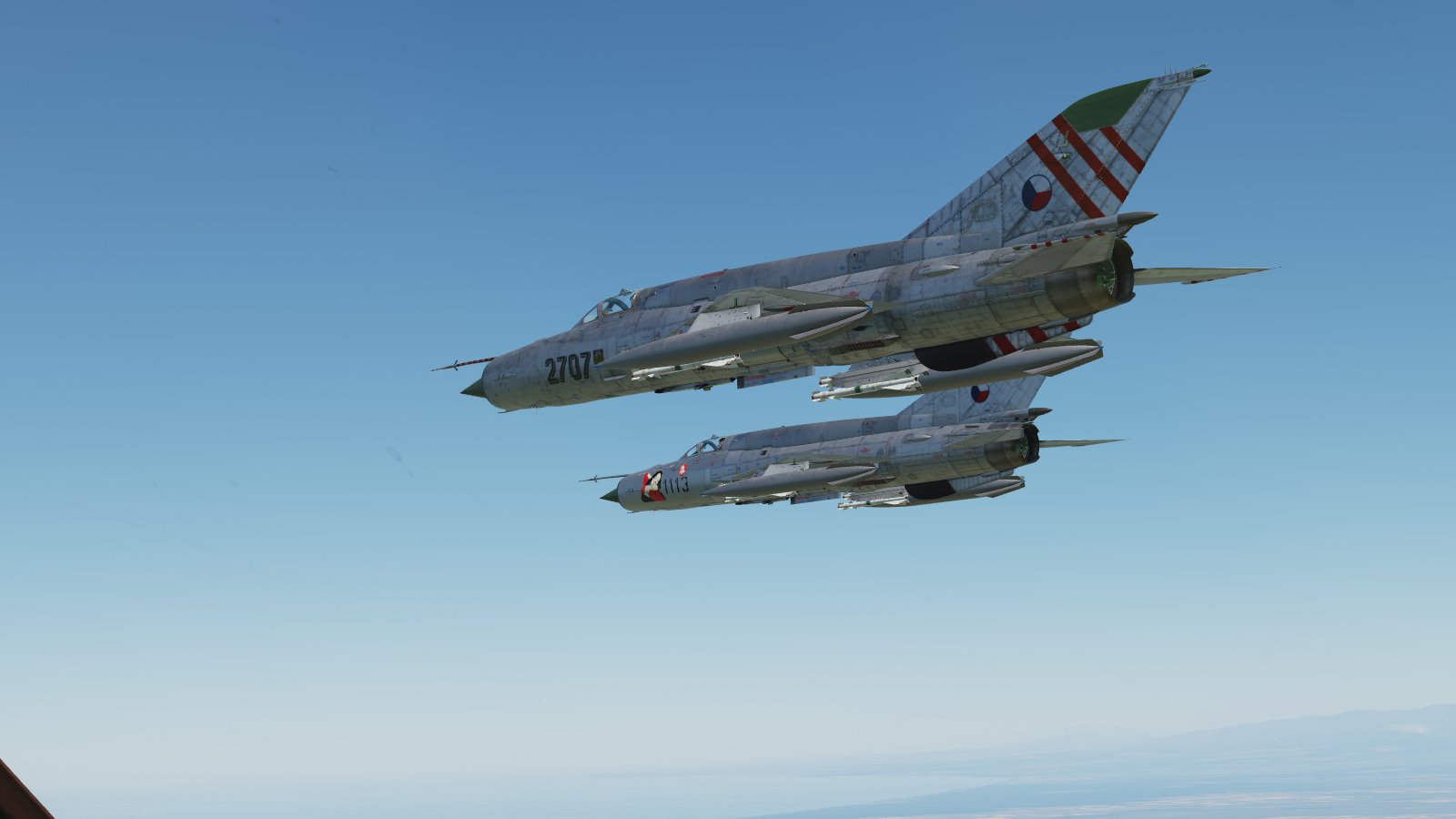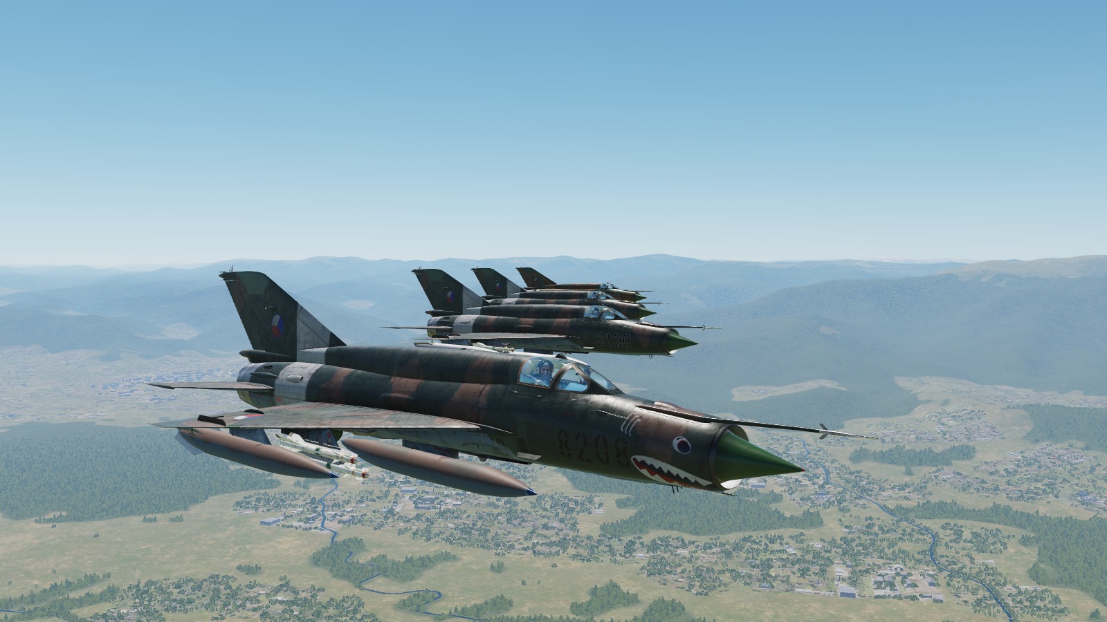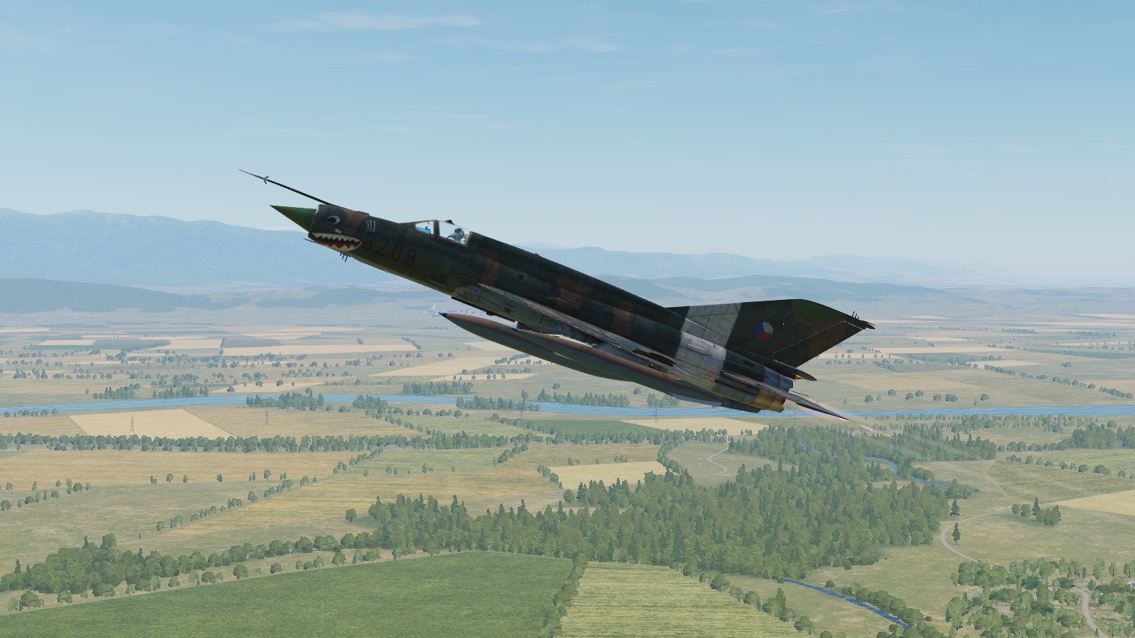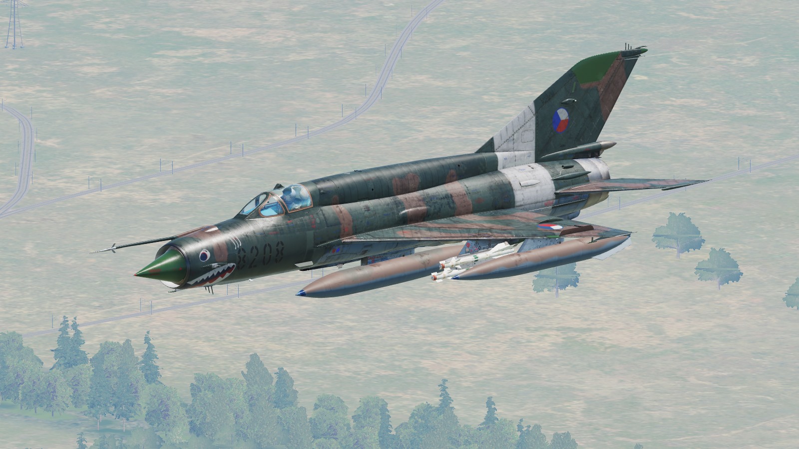 Mig-21MF, trupové zbarvení podle Migu trup, číslo 8208 v sestavě 2. letky. Skin má editovatelné trup, číslo v editoru DCS.