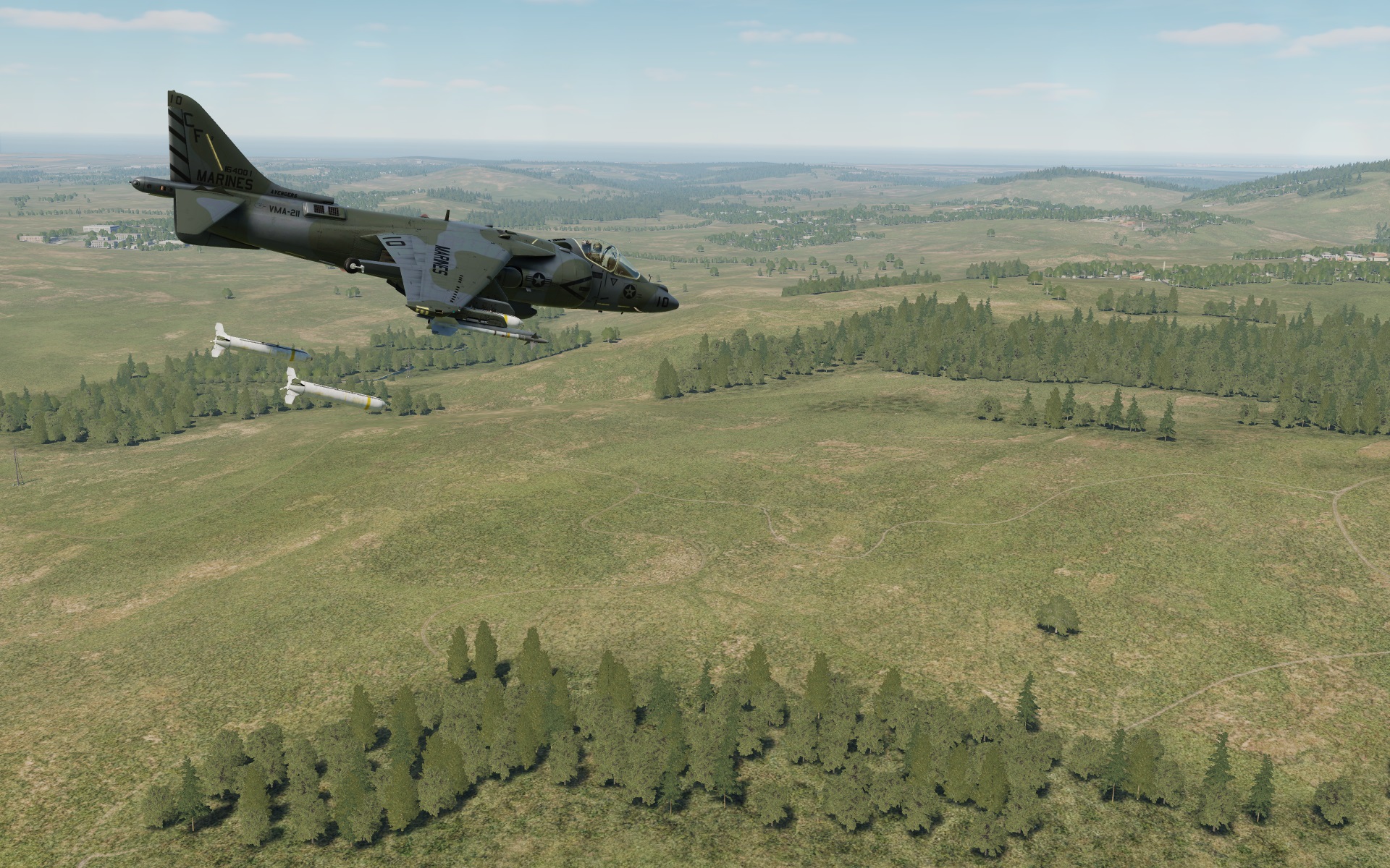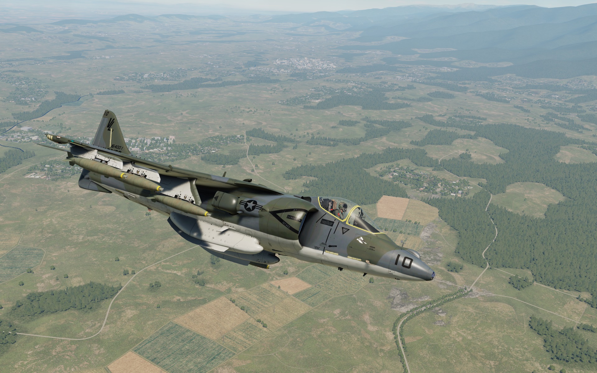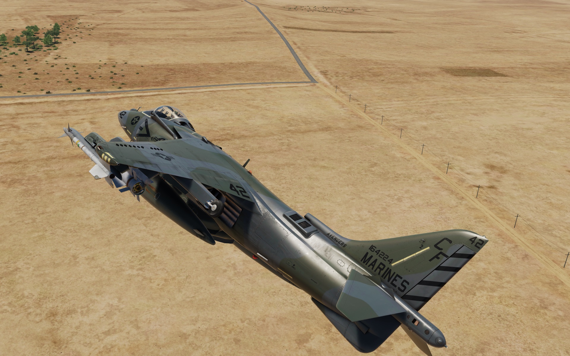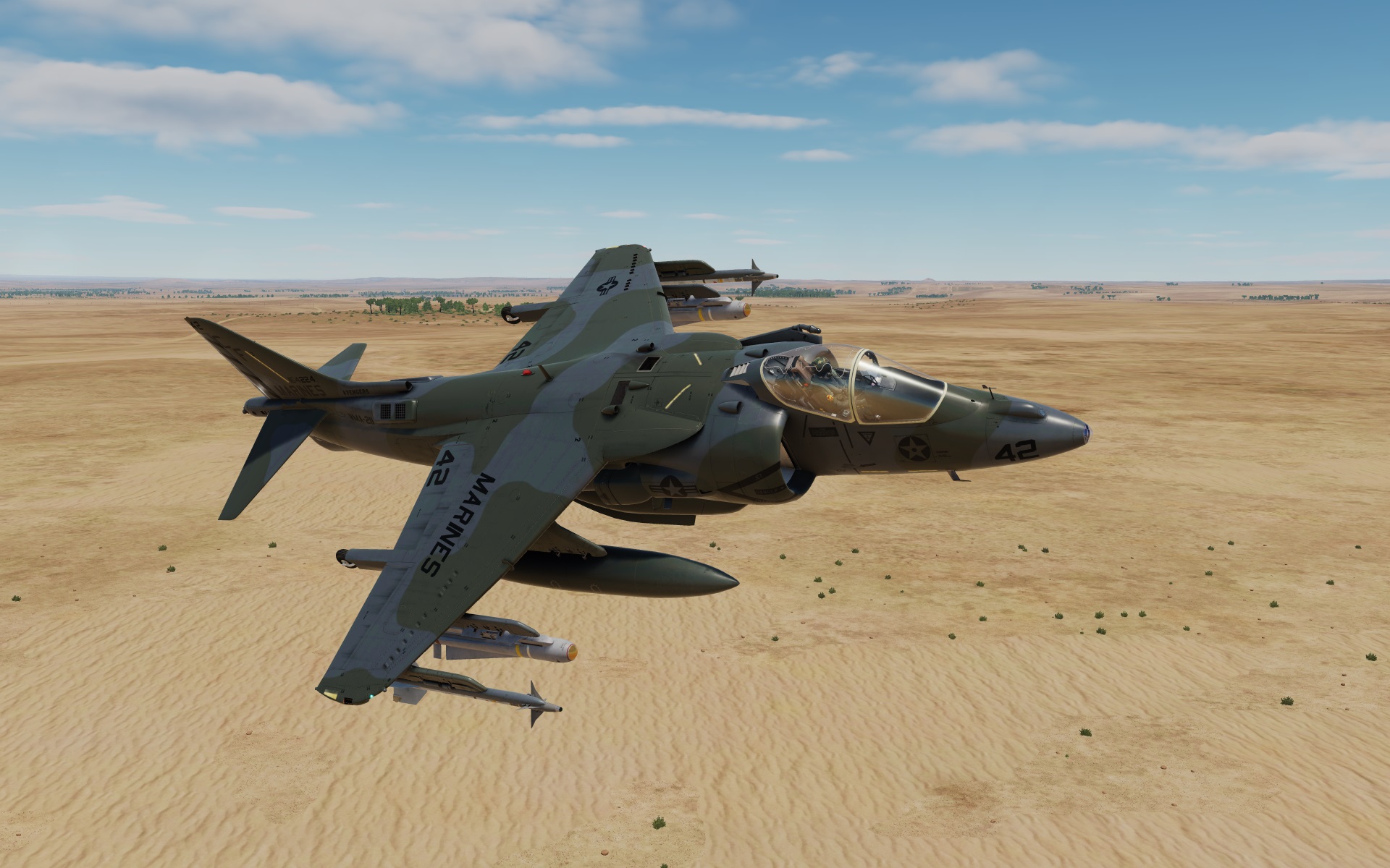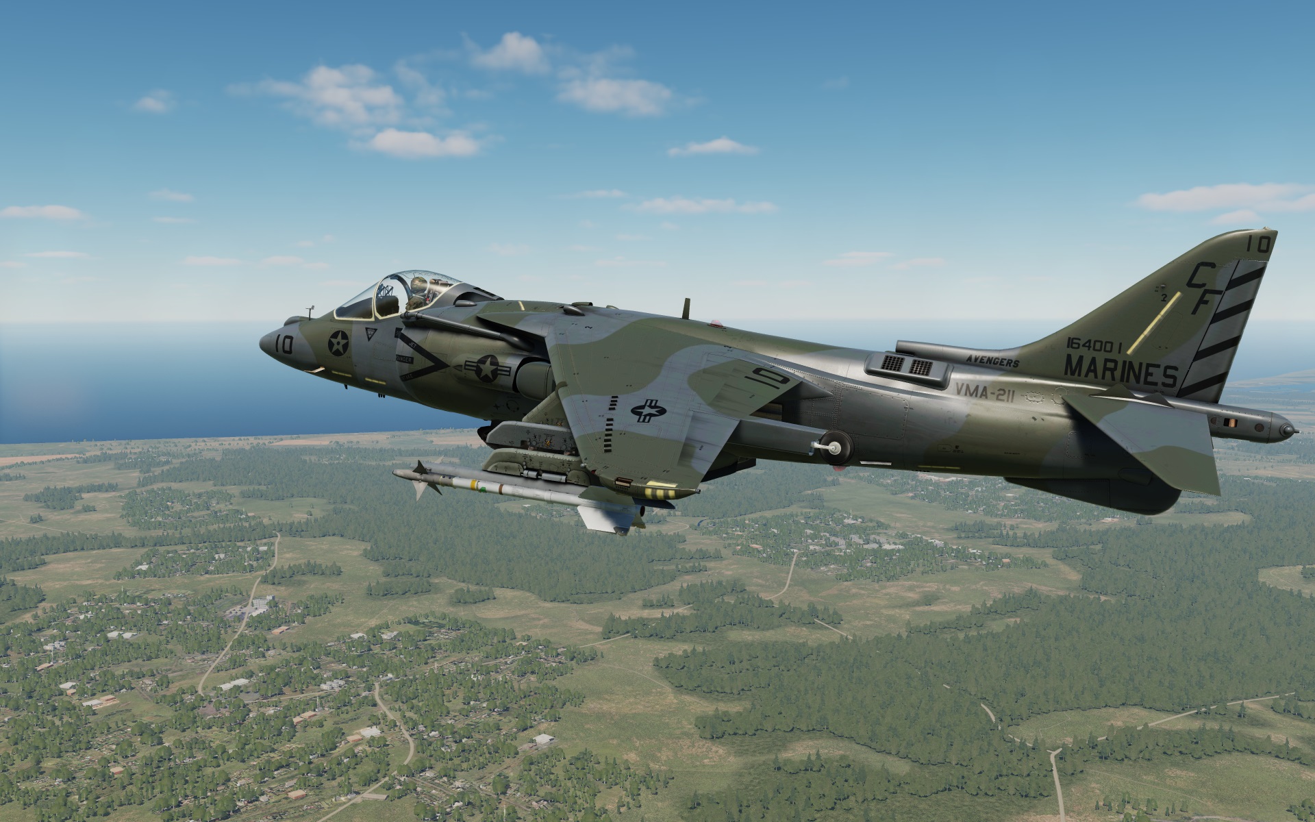 Land Camouflage Scheme as seen on late AV-8B Day Attack Harriers, as well as on early Night Attack Harriers. This livery represents a VMA-211 "Avengers" bird.