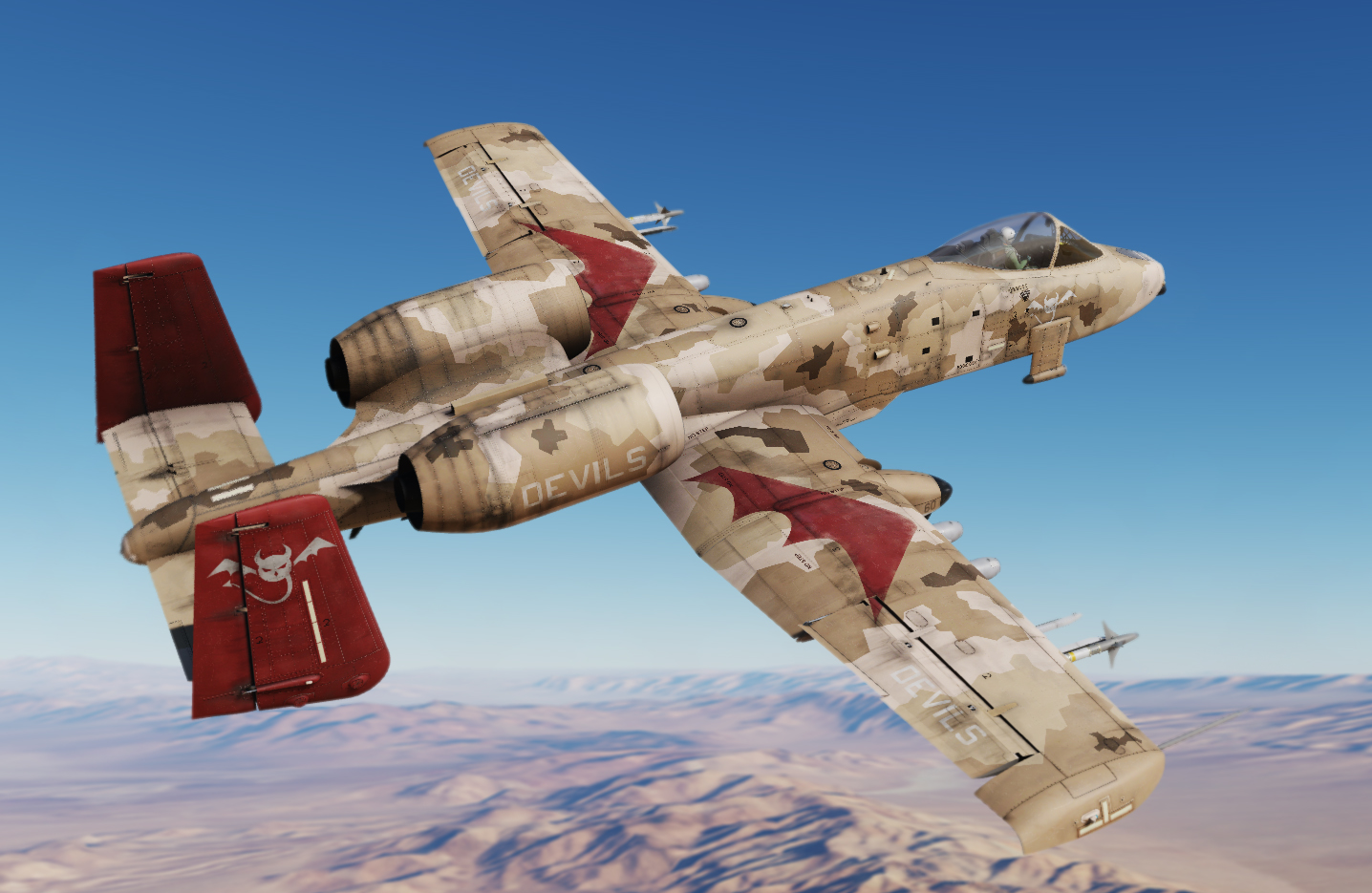 A custom made livery for a virtual Devils Squadron (DCS World). This package features 4 versions of the A-10A (can be used on the A-10C also): (1) Dotty (Desert), (2) Tammy (Classic Tri-Color), (3) Wendy (Woodland), (4) Grace (Gray/Winter). Make sure you check out the Low Visibility sister liveries of these Devils A-10's, the Low Vis livery features low visibility color devils wings and no red tail.