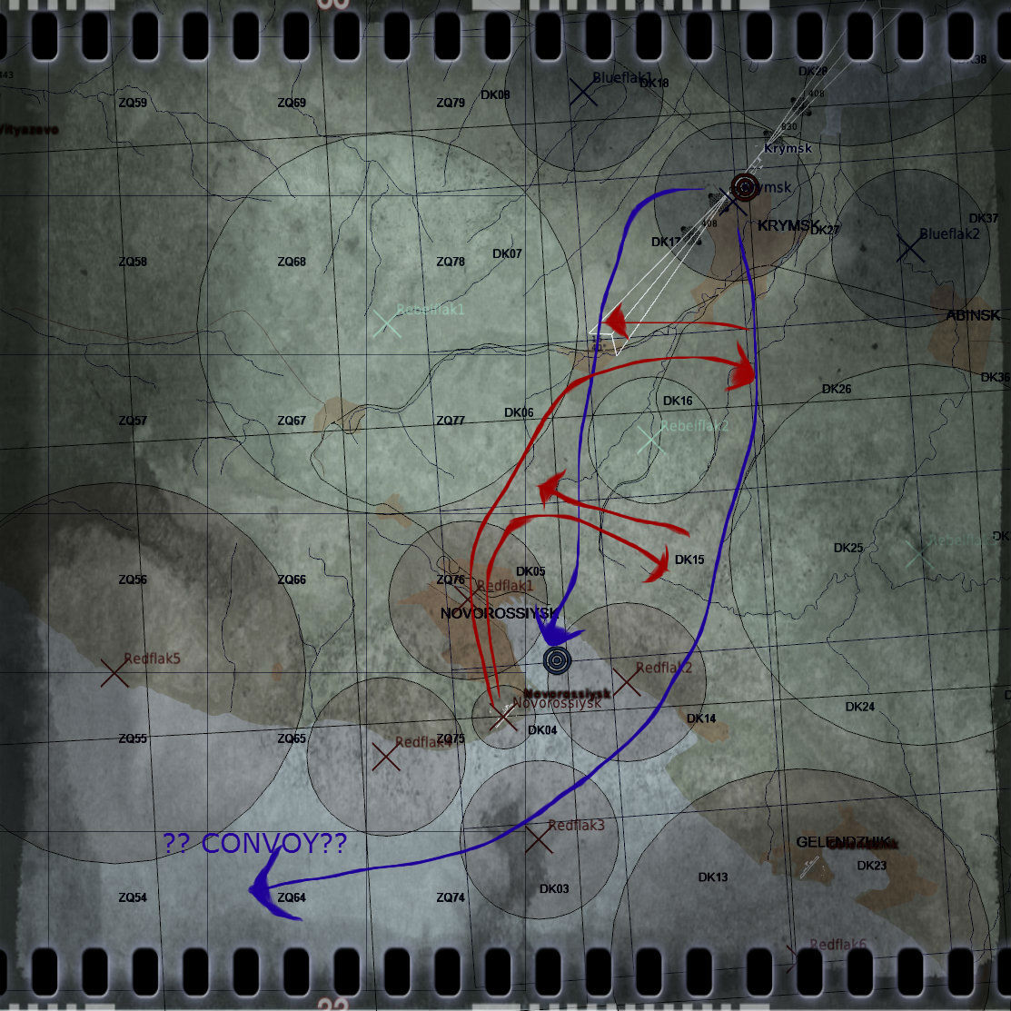 Part of a German fleet is stationed in Novorrosysk.  In support of the Eastern Front, a supply convoy is 2 hours front entering the harbor and resupplying the fleet assets.  BLUE must destroy the german fleet 100% OR the 9-ship resupply convoy from reaching harbor for win.  RED is defensive only.