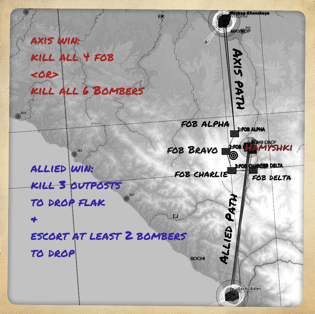 The city is protected by flak batteries being directed from 3 concrete outposts, Bluefor must bring the Flak down to allow 6 bombers to attack the weapons factory.