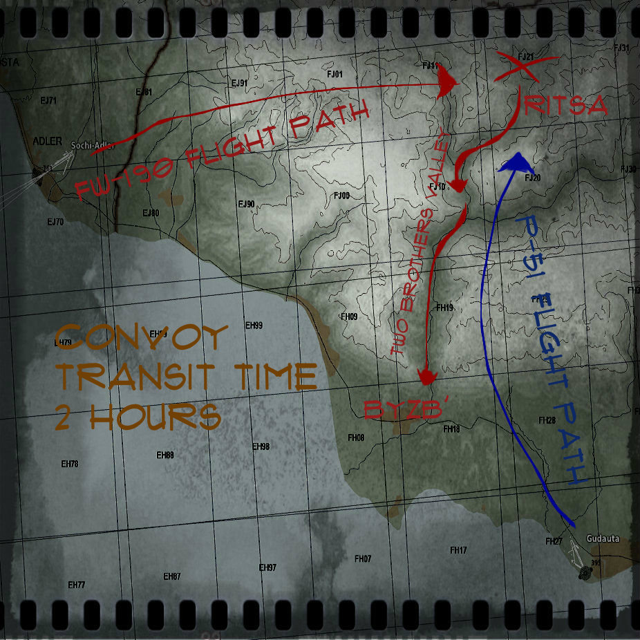 A German supply convoy is  performing a run down the famous "Goodbye Motherland" highway.  They are beginning their run from Lake Ritsa and will proceed south through the Two Brothers valley toward Byzb'.  Allied forces must prevent their arrival.  FW190 must protect them.