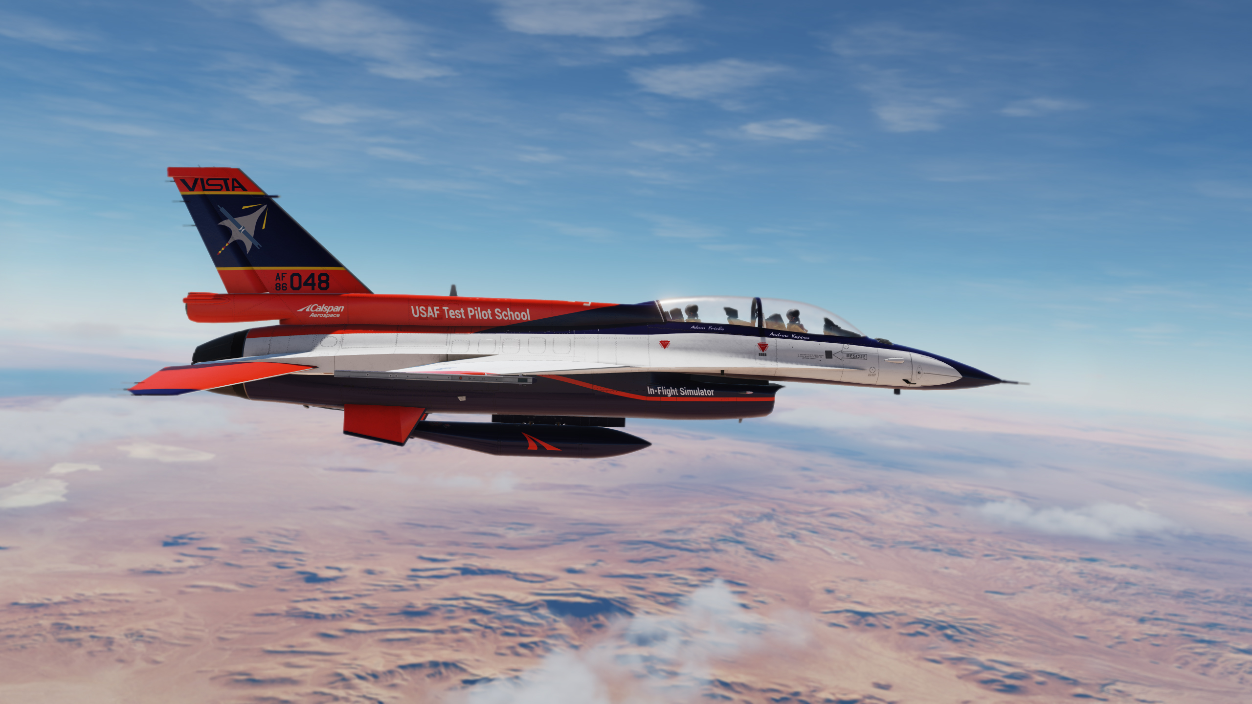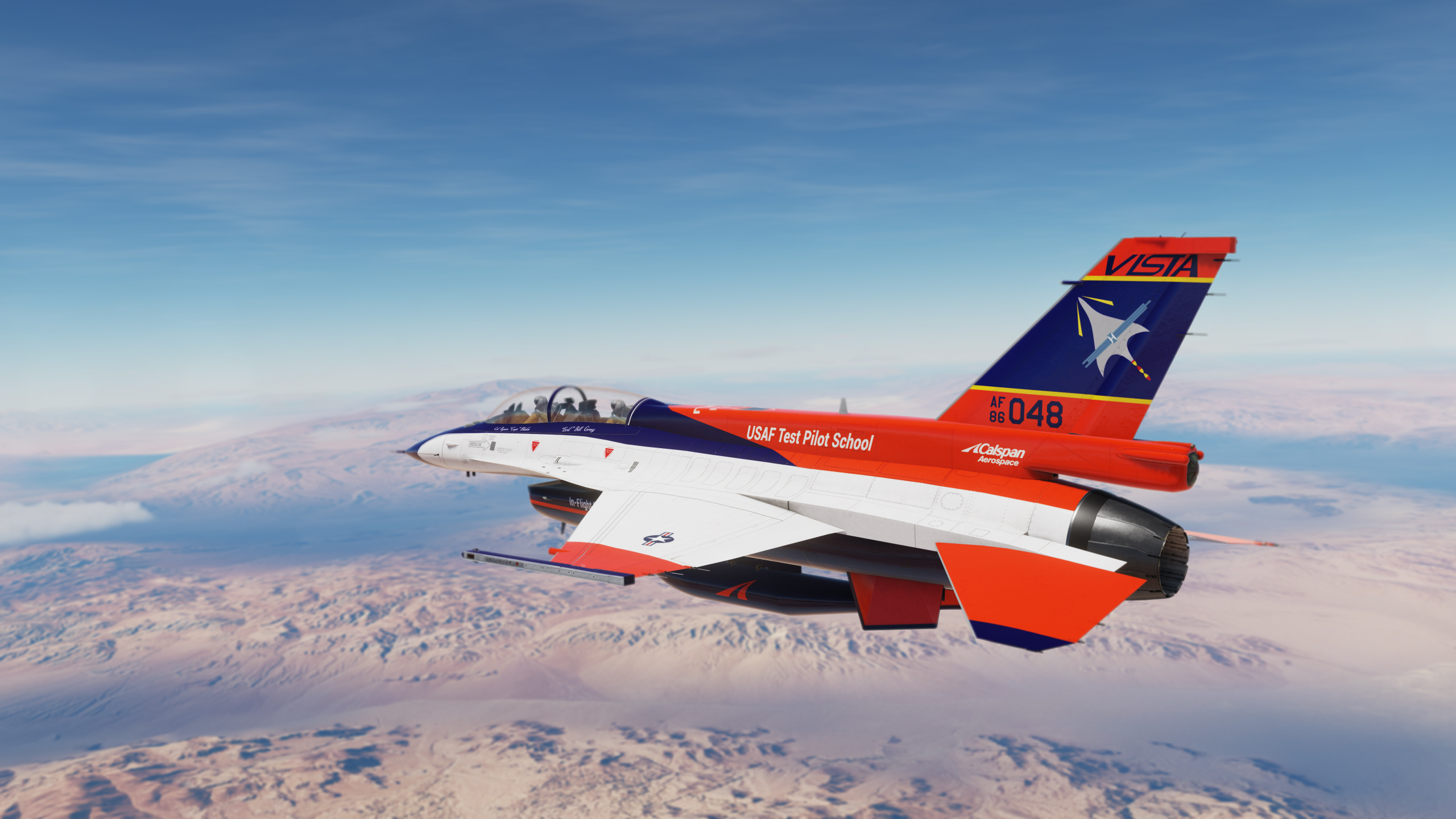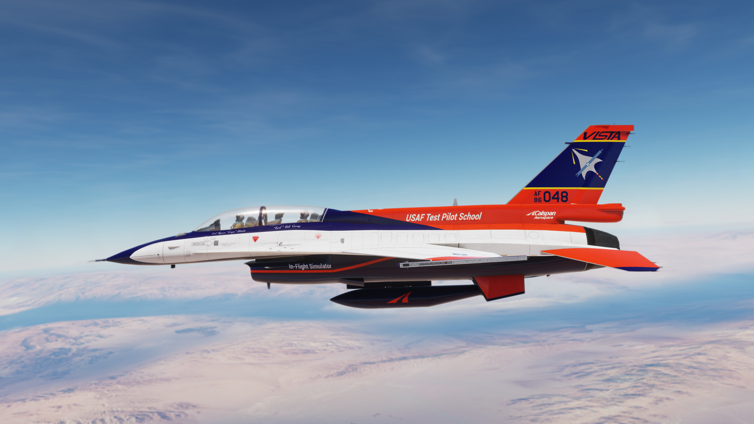 Serial number 72-1658 was the second YF-16 prototype built and flew test missions mostly at Edwards Air Force Base. It differed from it's partner YF-16 by having a blue and white camouflage scheme. This aircraft was also evaluated in 1975 by the U.S. Navy as a potential new Naval fighter. It lived an 8 year life as a test aircraft with the United States Airforce before being dropped from the inventory in 1980. It spent the next period of it's life being used as a test and instructional aircraft in Rome, New York, before finally being shipped back "home" to Fort Worth in 2020. The blue flight suit is an homage to the late Philip F. Oestricher and the other original F-16 test pilots. This aircraft is presently being restored to museum quality.