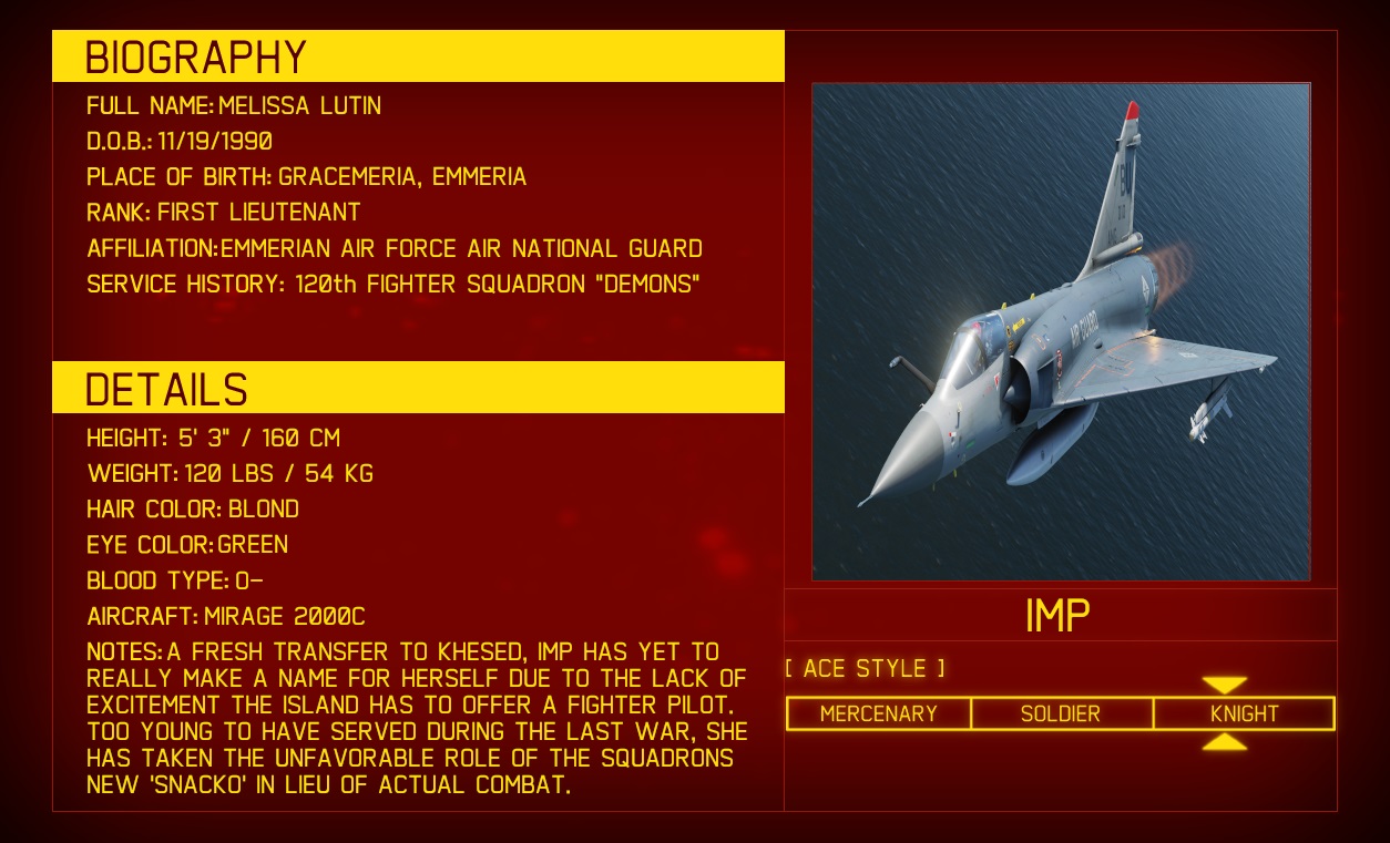 Established in 1966, the 15º Gruppo, commonly known as Windhover Squadron, is a component of the 8º Stormo flying out of Gracemeria AFB to defend the capital city of Emmeria. During the celebrations for the squadron's 50th anniversary in 2016 Estovakia invaded, with the element of surprise pushing Emmerian forces west to the island of Khesed, including the 8º Stormo and Windhover along with it. Flying throughout the war alongside their more famous sister squadron, 28º Gruppo "Garuda" flying the F-15EM Attack Eagle, the 15º put up a fierce resistance to the invading forces, ultimately managing to push the Estovakians back completely and liberating all of the occupied territory. Shortly thereafter, alongside Osean naval forces, the Emmerians destroyed the Chandelier railgun complex in the eastern sea. This aircraft, 12-0032, was piloted by the unit's commanding officer, Mag. Daniel Pollini who scored 23 kills throughout the conflict including one member of the infamous Strigon Squadron