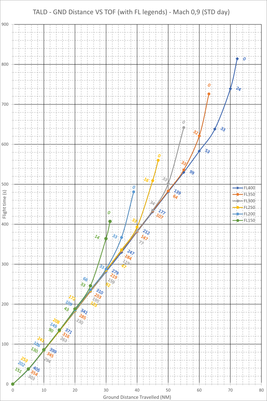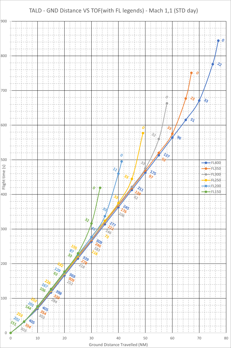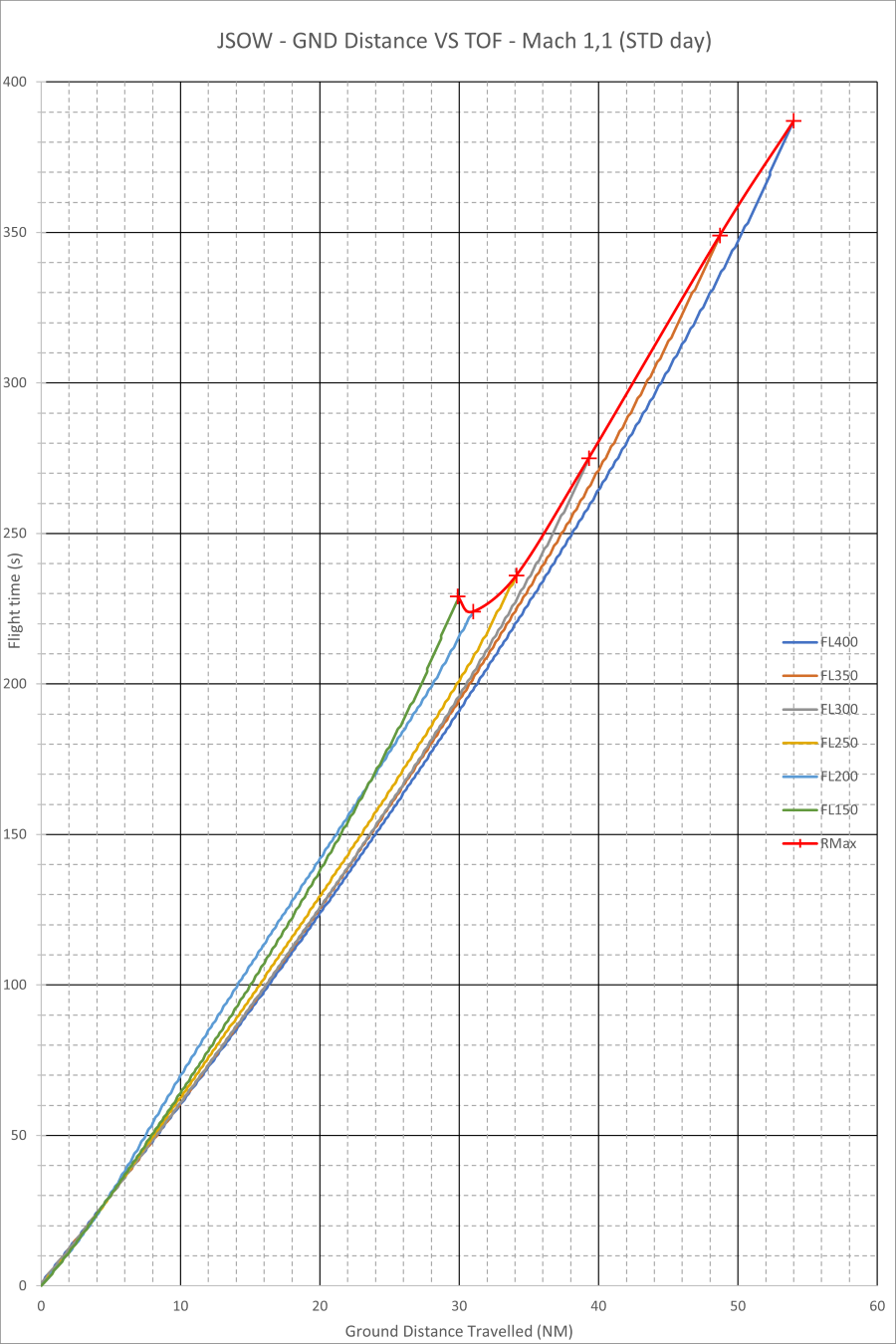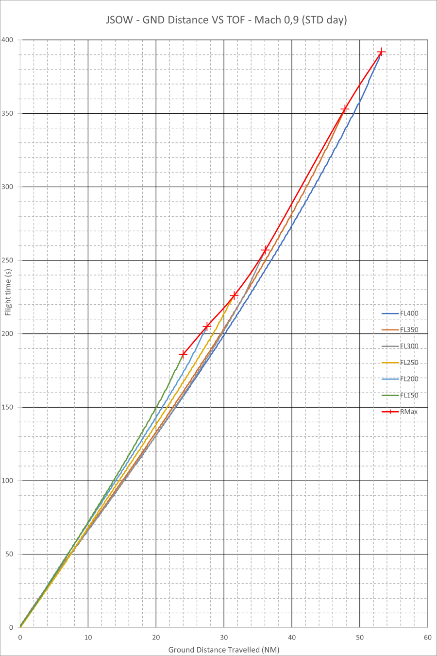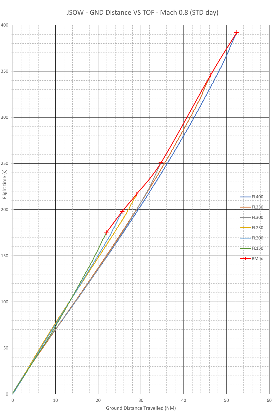 For your package synchronisation needs, these are kneeboard compatible (VR tested) graphs representing the ground distance covered versus the flight time of both the JSOW and the TALD for different flight parameters (Altitude and Mach dependent). No wind was considered and the day was standard with a +5°C offset to standard Free Air Temperature (which is 15°C).