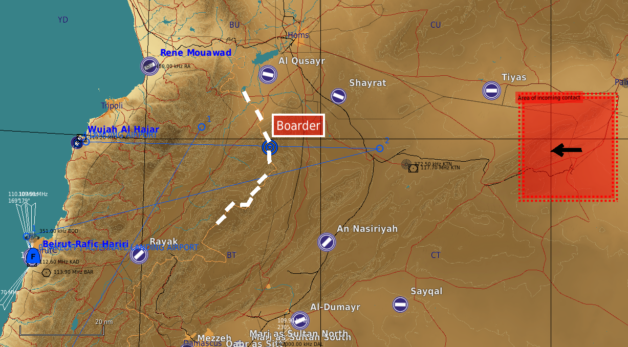 You and your wingman are stationed in Lebanon, at Beirut-Rafic Hariri airfield, on temporary assignment for a quick reaction force against possible incoming threats. Tensions between Lebanon and Syria are high, however there has been no actual fighting, yet. The coalition forces have ordered a no-fly-zone extending 100 nautical miles from the Lebanese border.