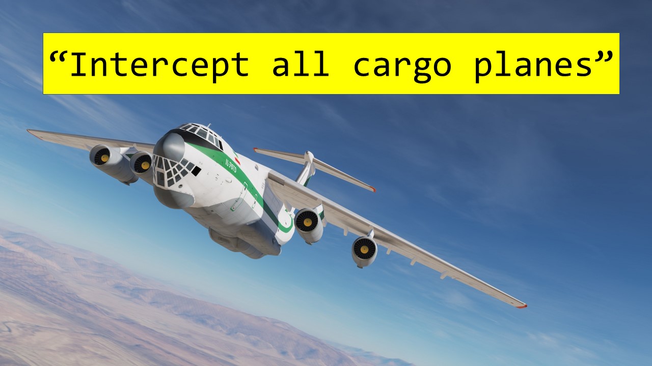 You are based at Akrotiri (Cyprus) and your job is to intercept a group of 5, 10 or 15 cargo planes trying to reach and land at a base on YOUR island. Select the ammount of cargo planes via the communication menu Other. Scramble as fast as you can and tune in on 251 Mhz. You will need the AWACS for guidance because the map is totaly blank! Use TACAN 107X to find your way back. Good luck on this cloudy day...