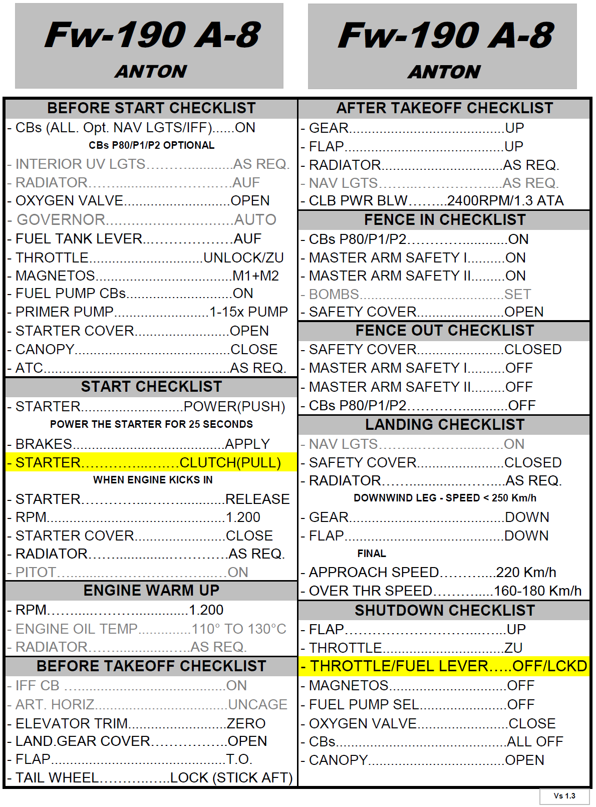 FW-190A8 Quick Checklist. (Update vs 1.3)