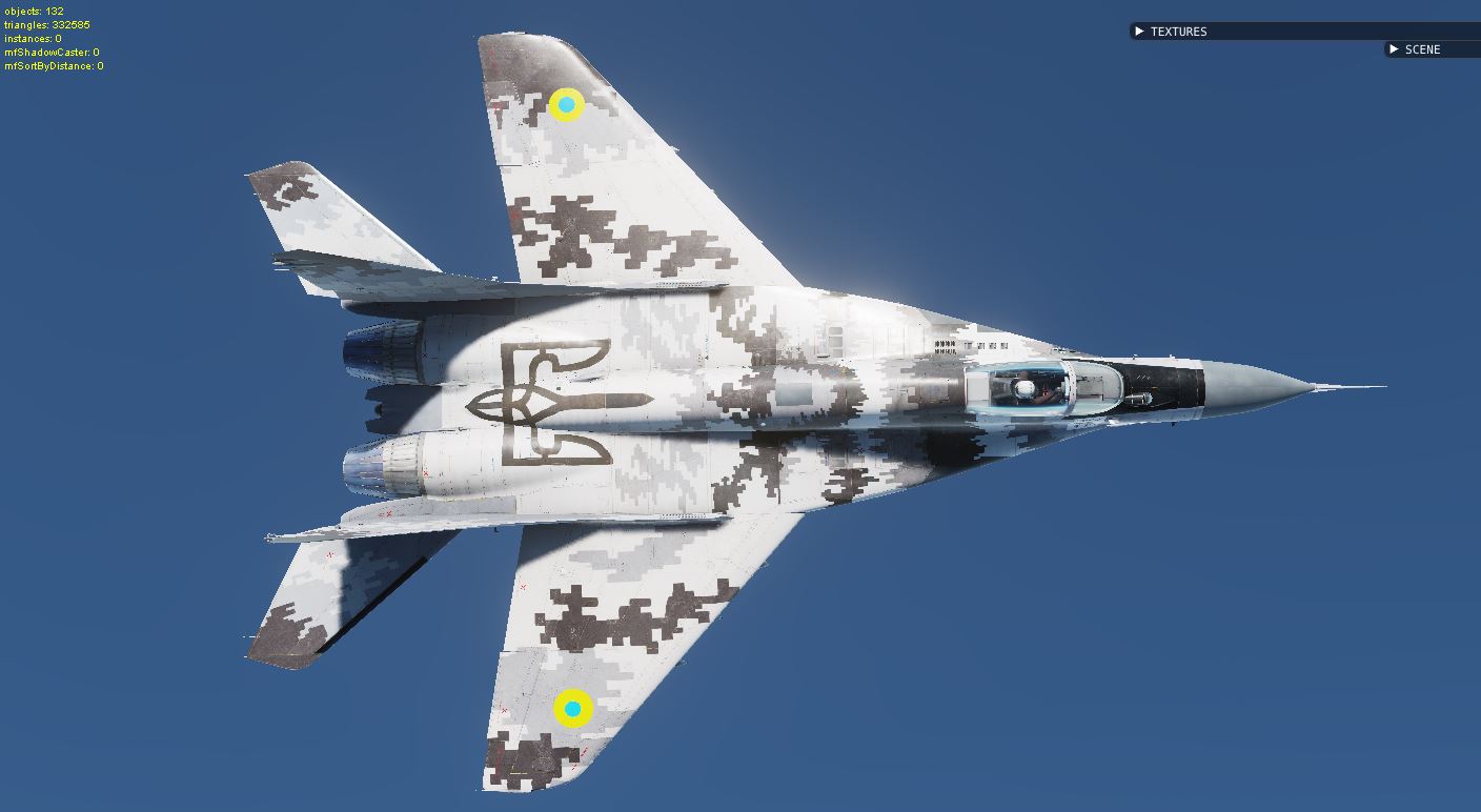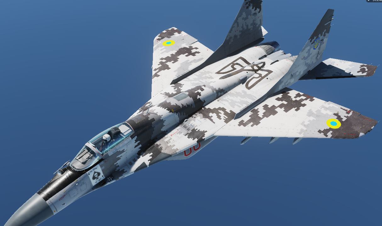 Livery of MiG-29 with bort number "57 White" in the new version of Ukrainian pixel where the coat of arms was removed from the back of the jet.